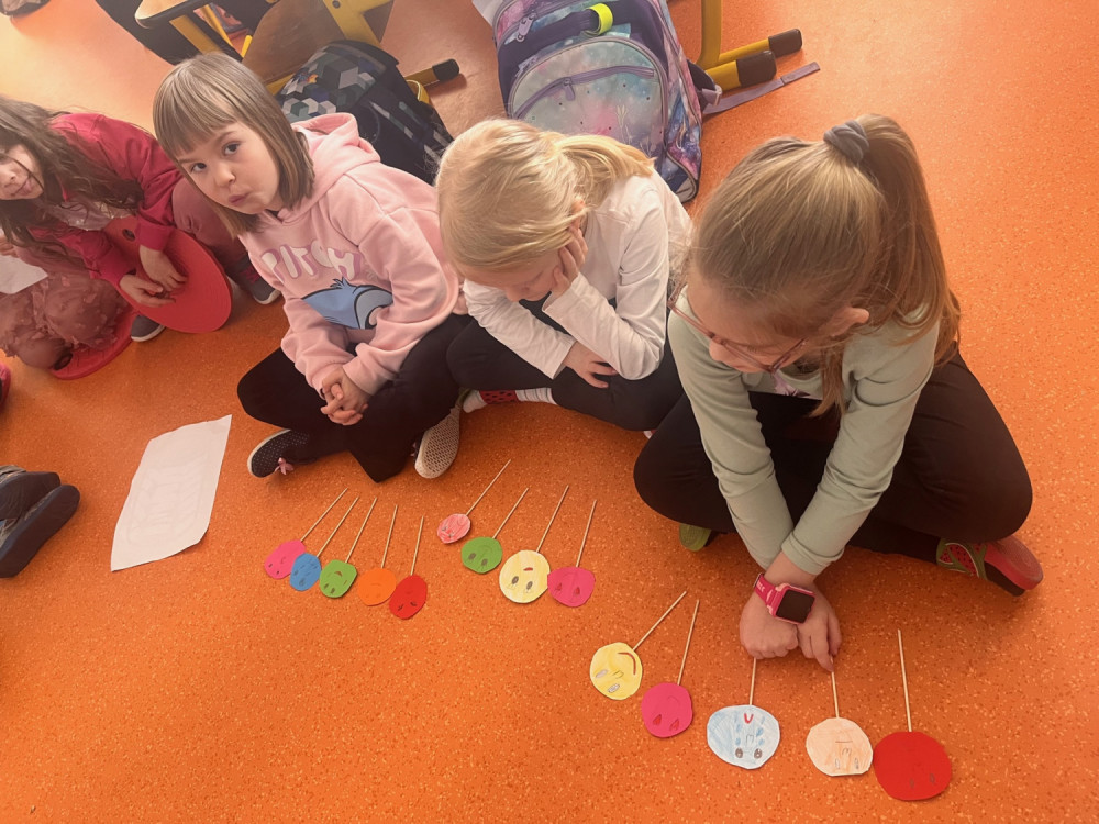 Únorová centra aktivit patří emocím. Co cítíme, jak se vyrovnáváme s různými pocity. V centru pokusů a objevů se učíme řešit konflikt se spolužákem pomocí tzv. semaforu. Situace natáčíme na video a se třídou společně rozebíráme. V ateliéru si vyrábíme emoji, v psaní se pokoušíme o komiks - což vůbec není lehké. Čtení patří radosti - plníme svoji sklenici, no a matematika je radost největší - tam programujeme interaktivního robota - Bee-Bota.