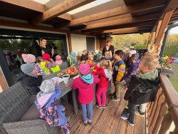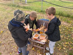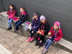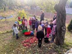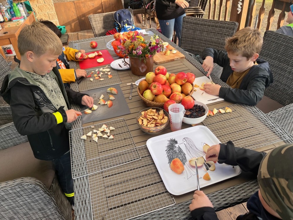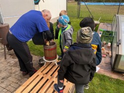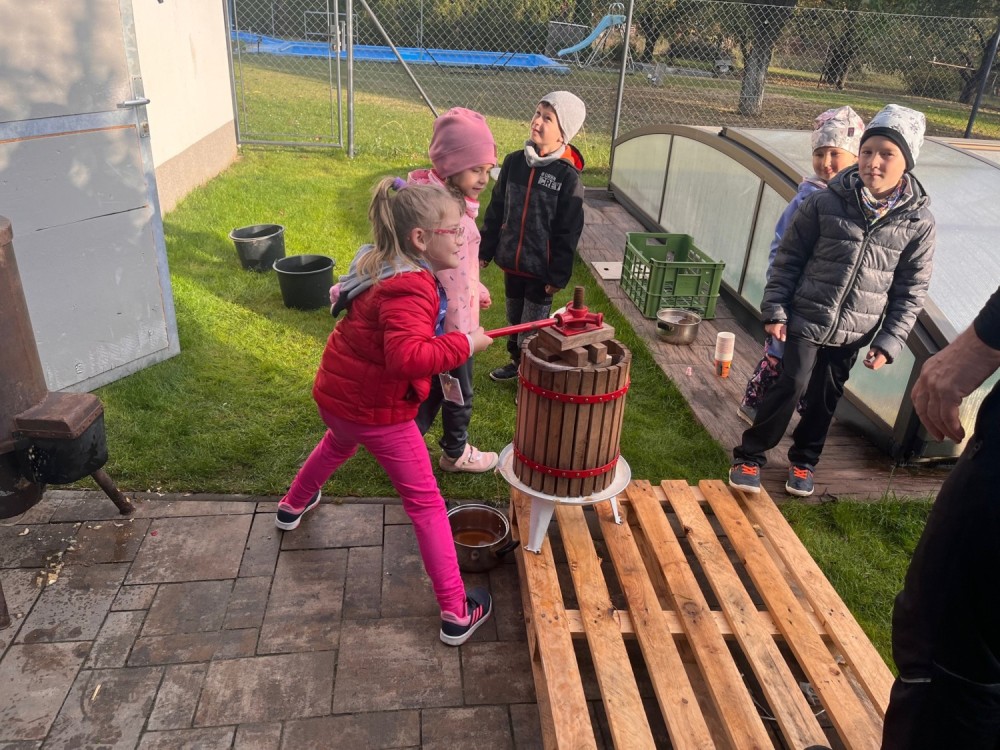 Před prázdninami jsme se společně vydali na zahradu k mamince jedné naší žačky - k paní Pelikánové. Spolu s dědečkem pro nás připravila dobrodružný program: na jednotlivých stanovištích jsme splnili úkol, za který jsme dostali razítko do karty. Krájeli jsme jablíčka na sušení, odvozili jsme jablka k dědečkovi, pod jeho dohledem jsme je vložili do drtiče a rozdrcená je přendali do lisu. Společnými silami jsme z jablek vylisovali šťávu, kterou nám paní Pelikánová na závěr nalila do lahví a směli jsme si ji odnést domů. Na dalších stanovištích jsme loupali ořechy, dlabali semínka slunečnic pro ptáčky, jako Jeníček a Mařenka jsme vydlabávali kukuřici nebo stavěli domeček pro podzimní vílu. Na závěr jsme si ve skupinkách připravili pro ostatní dýňové divadlo. Celé dopoledne jsme strávili na čerstvém vzduchu a příjemně unavení se vrátili na oběd do školy. Velké poděkování patří mamince - paní Pelikánové, která si pro nás tento program připravila! A prázdniny mohou začít :-).