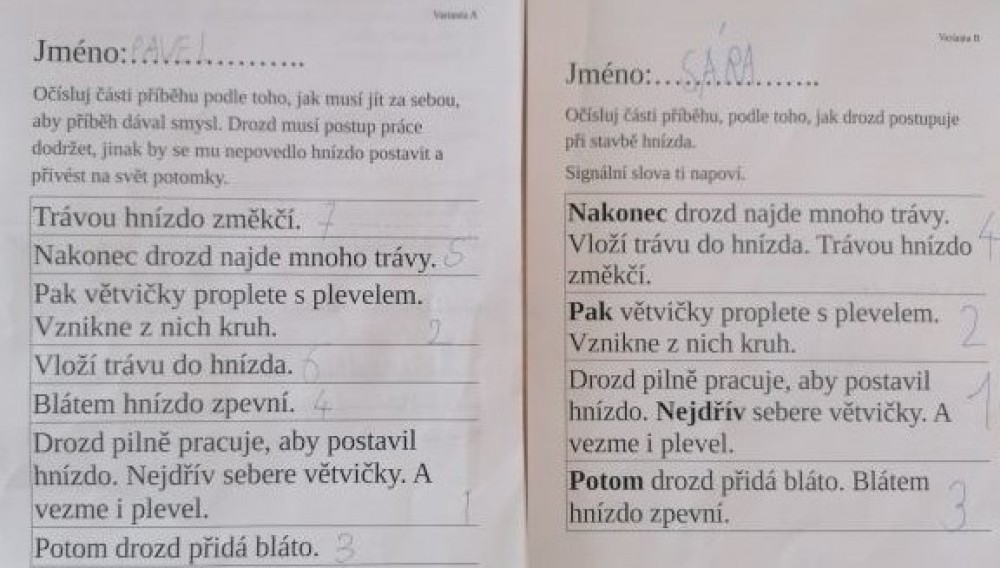 Od hlavní myšlenky textu, poučení, dramatizace a hodnocení chování hlavního hrdiny jsme postupně došli k určování časové a dějové posloupnosti. Příběh jsme skládali nejdříve ve skupinách, později samostatně. Učili jsme se v textu identifikovat signální slova, která nám při sestavování příběhu z částí pomohou.