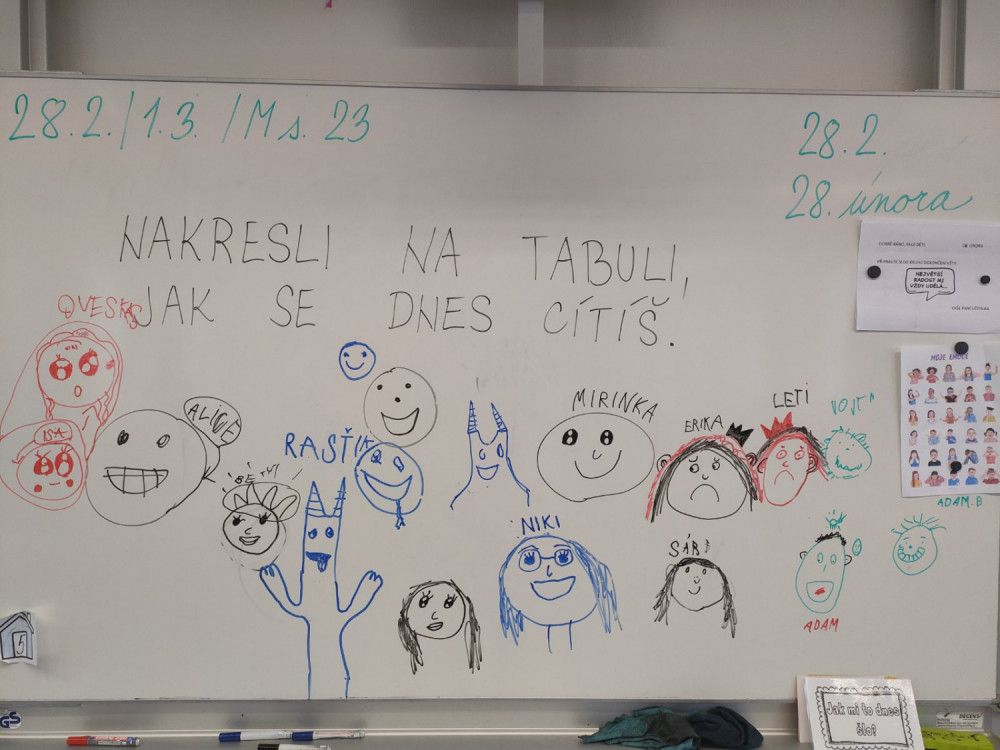 V rámci center aktivit na téma Emoce děti měly možnost povídat si a poznávat se navzájem. Každé centrum zahajovaly debatou o tom, jaké situace jim způsobují jednotlivé emoce, co jim pomáhá apod. V rámci centra pokusů a objevů jsme se naučili pracovat se semaforem na řešení konfliktních situací. Děti mohly natočit různé konfliktní situace na videa, která jsme následně rozebírali. Další zajímavostí bylo programování Bee-Botů, které všechny moc bavilo. Každý si vyrobil své smajlíky na hodnocení pocitů při práci ve třídě a Sklenici radosti k uložení do školního šanonu.