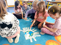 Tento den jsme věnovali ochraně životního prostředí. Zamýšleli jsme se nad tím, co naší Zemi prospívá a co jí naopak škodí. Pracovali jsme s obrázky dvou zeměkoulí – jednou veselou a druhou smutnou, ke kterým jsme přiřazovali věty popisující správné nebo škodlivé chování lidí.
