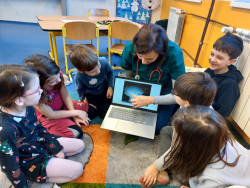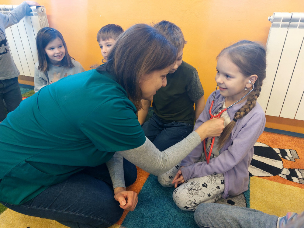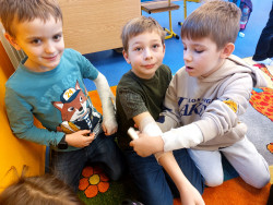 Do výuky za námi přišla maminka jednoho z nás. Pracuje jako lékařka v nemocnici. A tak jsme měli příležitost dovědět se hodně nového o našem těle, k čemu slouží některé orgány a co se děje, když onemocníme a musíme k lékaři. Viděli jsme rentgenové snímky hlavy a končetin a poslechli jsme si fonendoskopem svá srdíčka. S nadšením jsme se vzájemně obvazovali. To se nám docela dařilo a taky nás to moc bavilo. Za zdařilou práci každý z nás dostal injekční stříkačku.