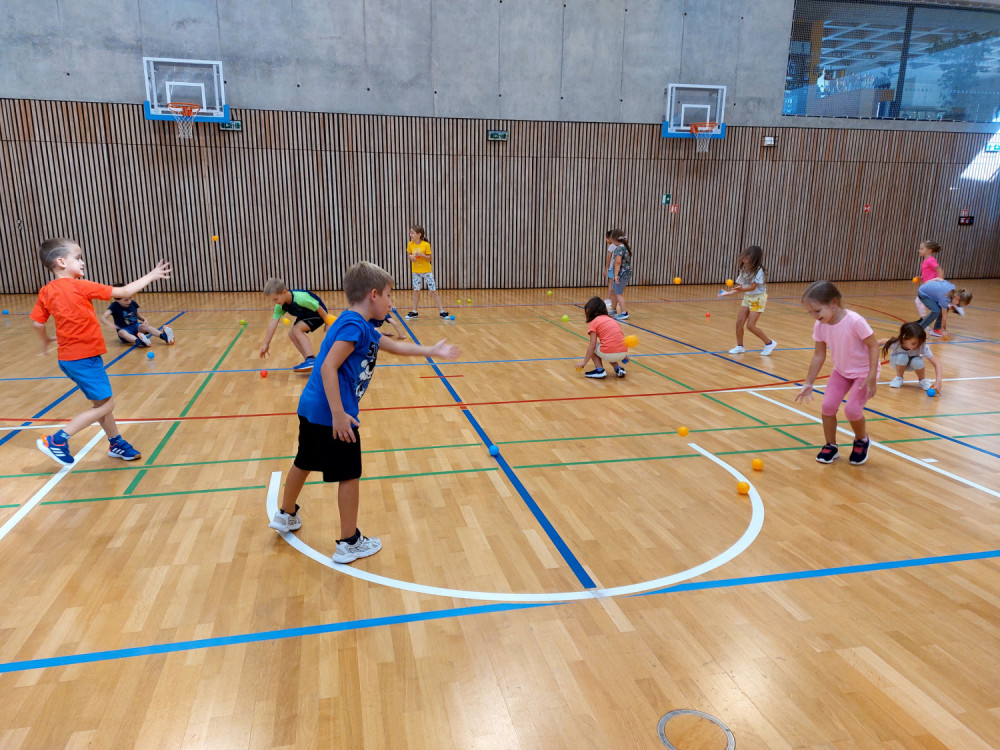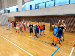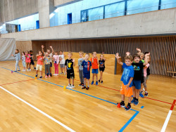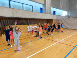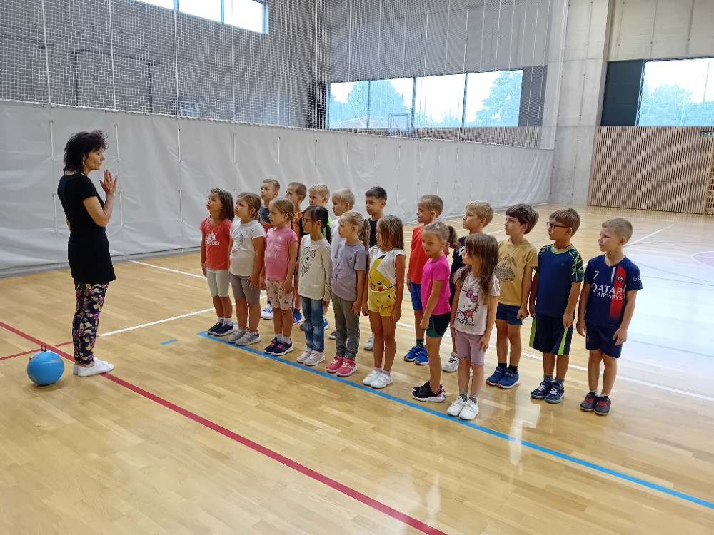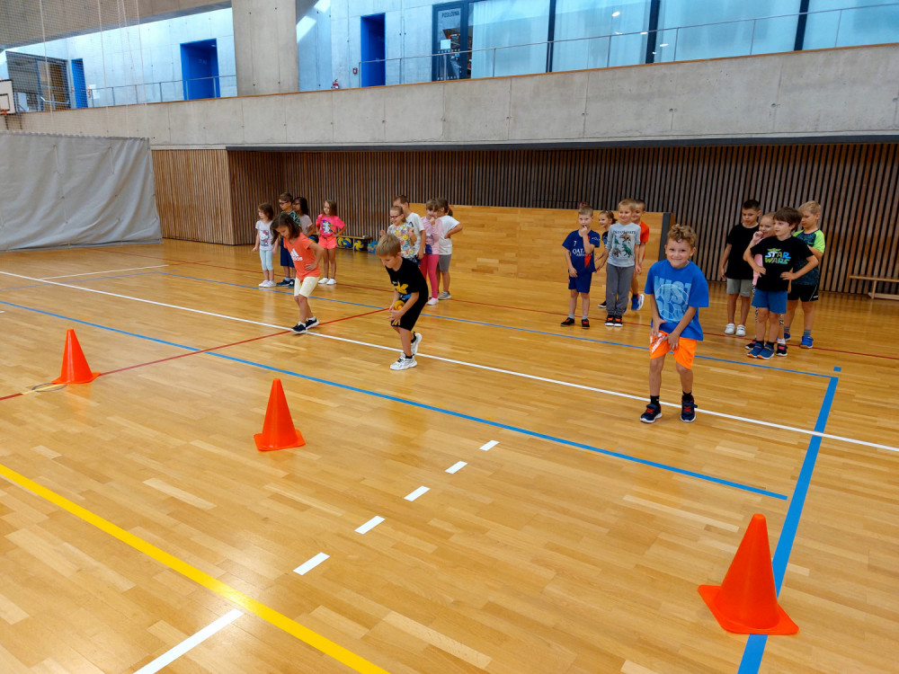 Bez nástupu a zahájení hodiny pozdravem to snad ani nejde. I rozcvička musí být a dál už soutěžně a zábavně, alespoň pro začátek. V dalších hodinách nás čeká nácvik hodu horním obloukem, ten ještě někteří nezvládáme, a můžeme se pustit do míčových her. Vedeme si dobře, pohotově reagujeme na povely paní učitelky. Ta z nás má radost.