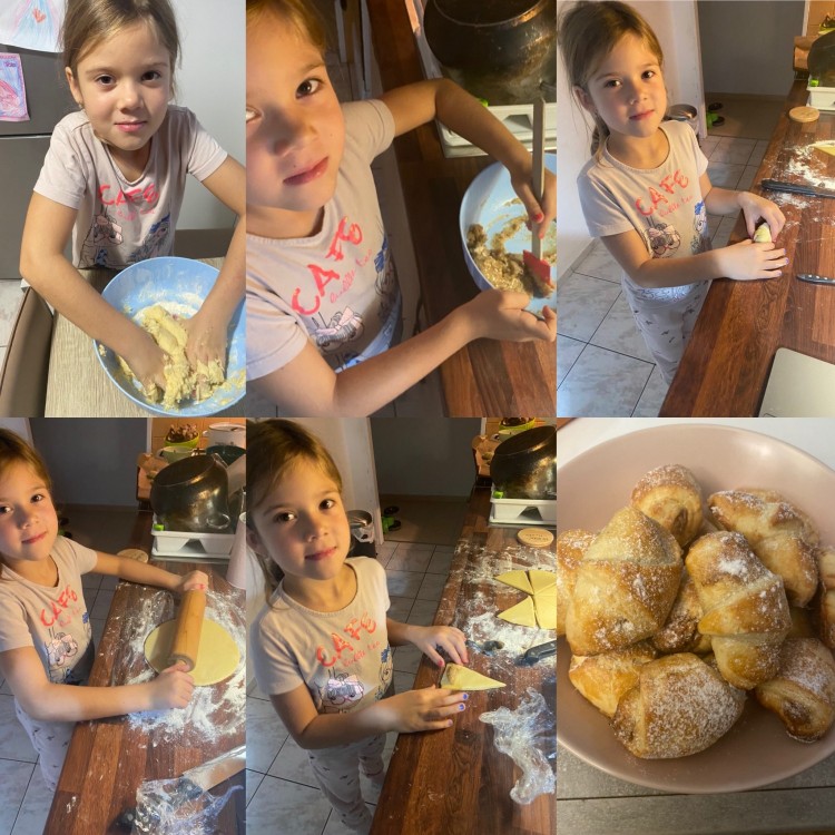 Psaný projev – správný úchop šlo hodnotit na základě zaslaného videa. Základní motorické dovednosti, které se pokoušela na dálku rozvíjet paní učitelka Švancarová, šly hodnotit obdobně. Rozvoj jemné motoriky prověřila i příprava a pečení Martinských rohlíčků.