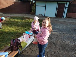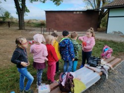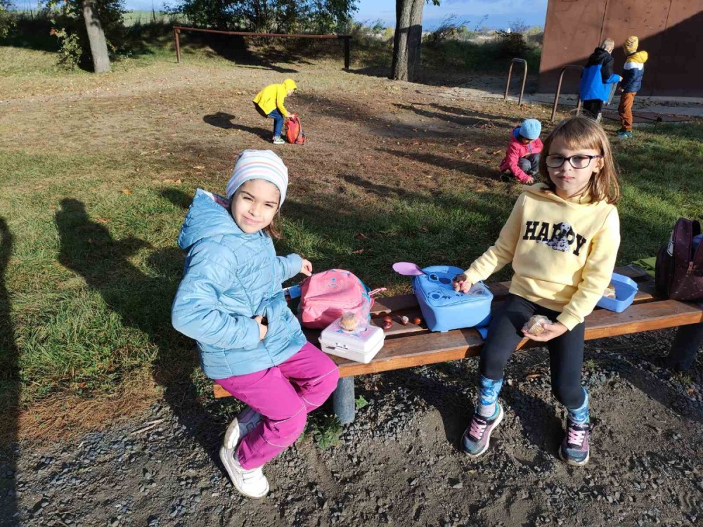 Využili jsme pěkné počasí před podzimními prázdninami a vyrazili na pozorování změn v přírodě. Děti měly za úkol sledovat trasu výletu a sbírat obrázky do venkovního Binga. V areálu Pod kaštany jsme se zabavili výrobou přírodních mandal z podzimních plodů a listů. Nakonec jsme šli nahlédnout na koně a zvířata na poli, jak se jim daří a už jsme spěchali zpátky na oběd.