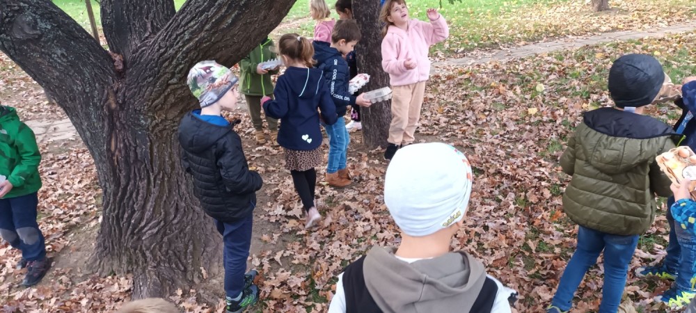 Procházka po okolí školy se stala honbou za pokladem podzimních přírodnin - kaštan/jírovec, žalud/dub, listy, kámen, kůra, větev, jehličí, šiška, javor a šípek. Každé dítě si vytvořilo pokladničku z obalu na vajíčka a cílem bylo zaplnit ji. Když si tyto kousky přírody samy vypátraly a uložily do pokladničky, snáze si zapamatují jejich názvy a poznají je. Děti byly mnohem pozornější, vnímavější k přírodě a svému okolí.