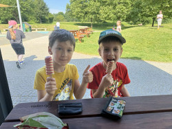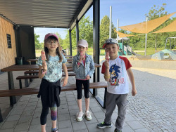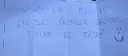 Na závěr center aktivit jsme se vypravili na stezku skřítků za pokladem. Ve třídě jsme získali nápovědu - hledej fialovou stopu a po té jsme se přes 11 skřítkových úkolů dostali až k pokladu. Ale to by nebyli skřítci, kdyby se vše podařilo, jak si myslíme. Na konci cesty nás čekalo nemilé překvapení - poklad schovali ve třídě! Naštěstí nás navedli téměř k hřišti Olympia, kde jsme na naše malé zklamání rychle zapomněli :-). O to lépe se nám šlapalo zpět, když jsme se mohli těšit na překvapení.