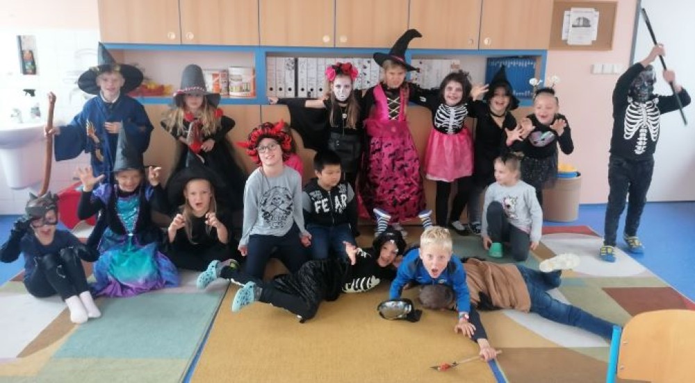 Členové školního parlamentu si pro nás připravili   přehlídku kostýmů spojenou se svátkem Halloween. Učení v kostýmech nás moc bavilo. Zatančili jsme si i Tanec kostlivců. Parlamente děkujeme!
