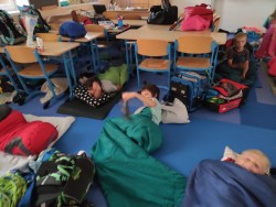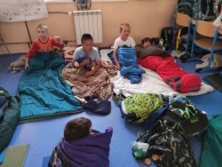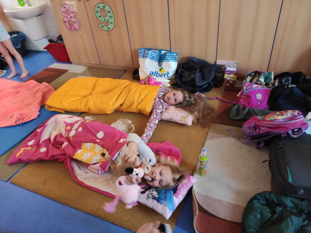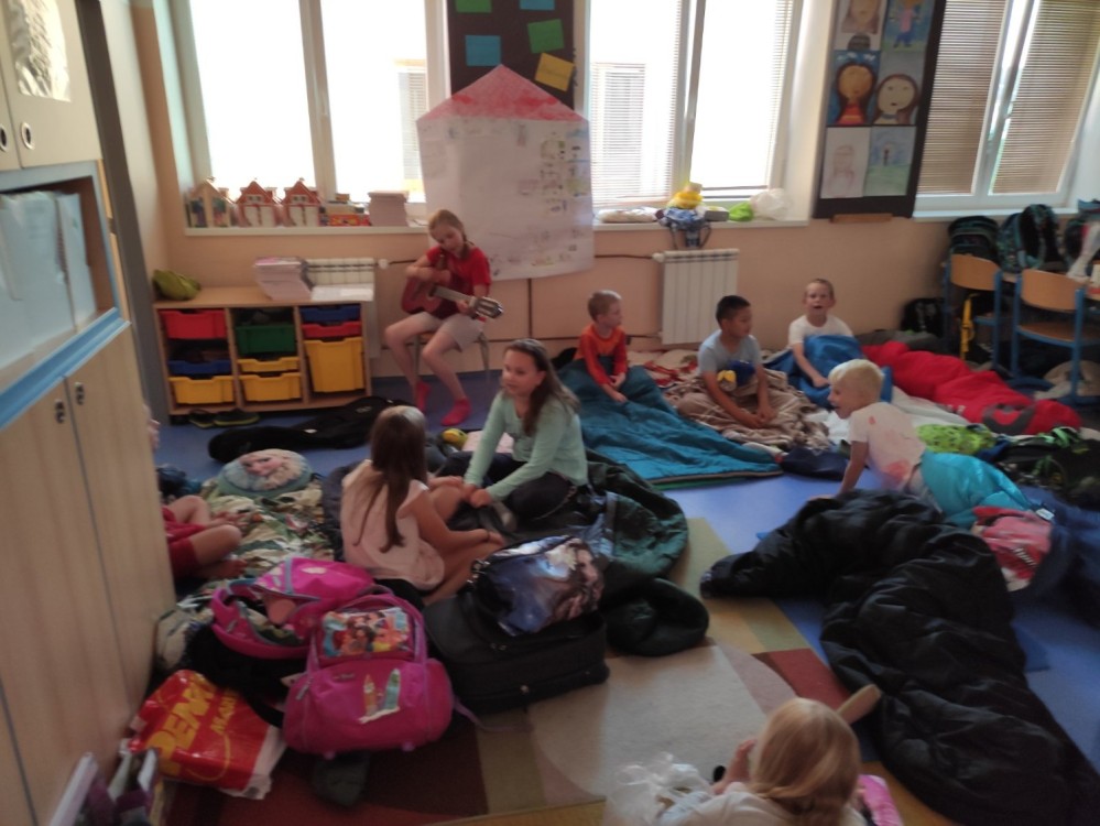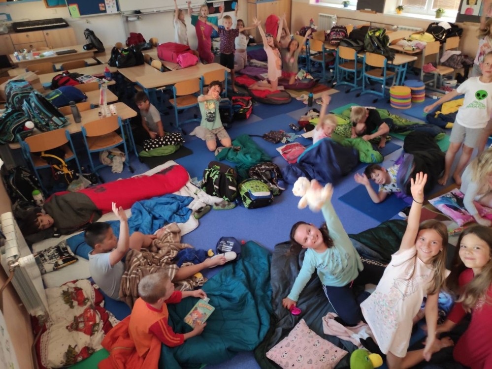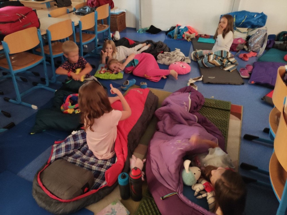 První společné spaní ve škole proběhlo na letní slunovrat. Jelikož je to nejdelší den v roce, i náš byl dlouhý. Po setkání ve škole jsme se vydali Pod kaštany na trochu prolézání, fotbalu a pěvečkého vystoupení. Na louce jsme zvládli venkovní hru ve skupinkách a spěchali na večeři. Piknik ve třídě byl bohatý a spousta dobrot nám také zbyla na energii na další den. Budíček jsme měli v 5:21 v duchu toho, že na slunovrat je i nejkratší noc! Ráno jsme si třídu zase krásně uklidili, nesměl chybět ranní fotbálek ve cvičebně a rozcvička u hřiště. To vše ještě před vyučováním! Těšíme se na spaní No.2, ale to až příští rok.....