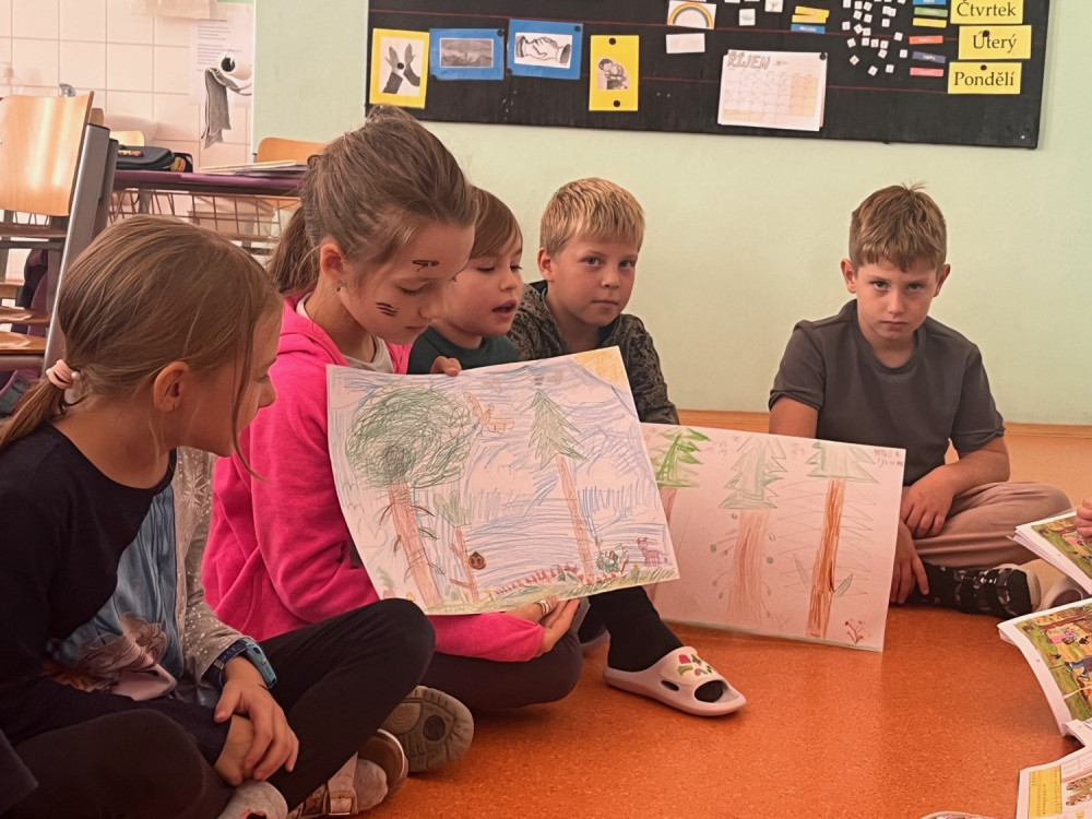 V říjnových centrech aktivit pozorujeme a objevujeme vlastnosti plodu růže šípkové, počítáme příklady a skládáme obrázek, rozhodujeme o pravdivosti vět a vymýšlíme životabáseň a také jsme zjistili, že v lese najdeme čtyři patra, která jsme se pokusili nakreslit.