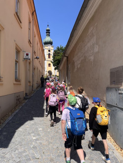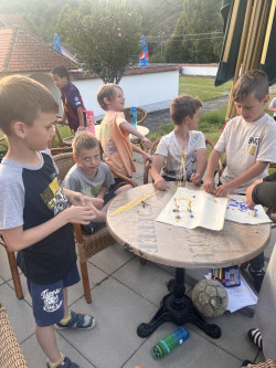 Stále plujeme na palubě jako piráti - tentokrát doslova, protože jsme se po zdolání Granátové stezky obsahující nádherný výhled na zámek i na přehradu, nalodili na Poseidona. Po vyhlídkové plavbě, kdy jsme měli celou loď jen pro sebe, a po návratu na základnu, jsme měli za úkol postavit co nejvyšší věž, která nesmí spadnout. To se všem skupinám podařilo, jelikož následovala tzv. foukací zkouška - a stavby opravdu vydržely :-). A teď už jsme zvědaví, co nám přinese čtvrtek!