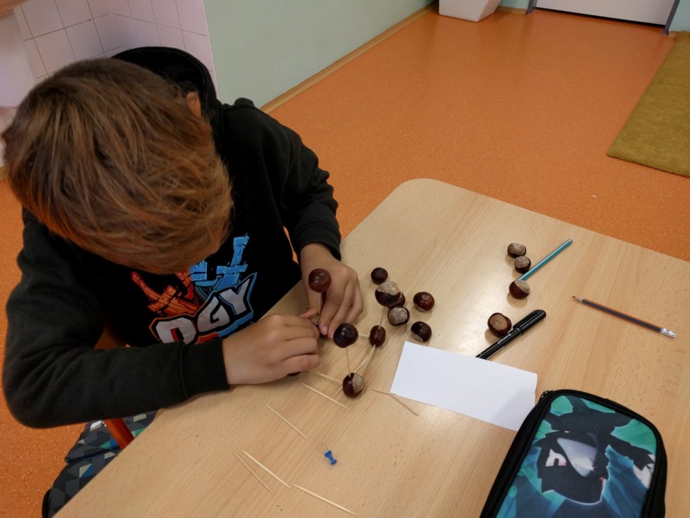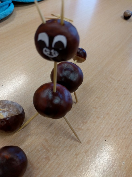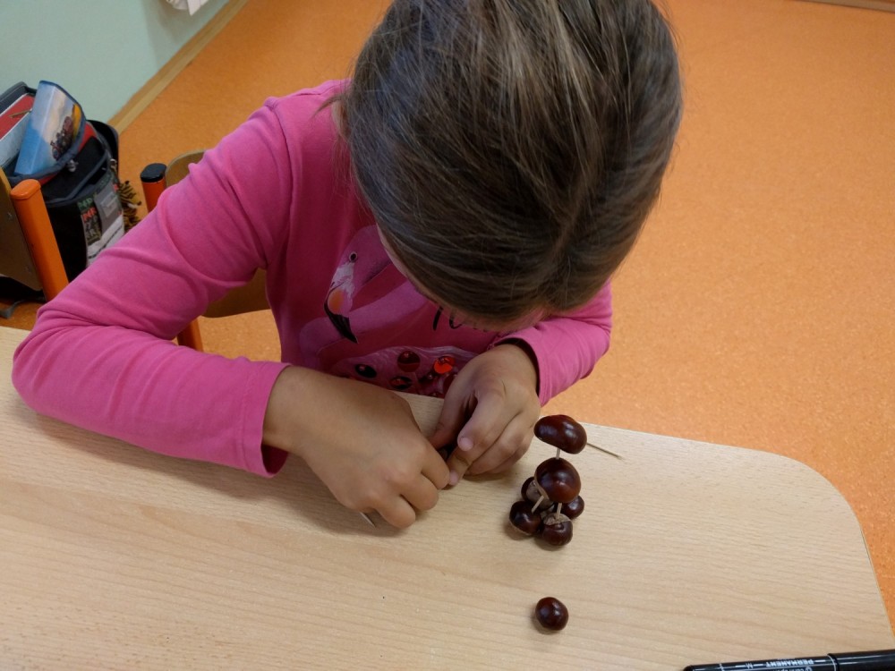 V  pracovních činnostech jsme se pustili do výroby zvířátek z kaštanů. Moc nás to bavilo,zapojili jsme fantazii a ježci, žirafy, housenky a jiná zvířátka se nám hezky dařili. Velká pochvala patří Klárce, která vlastnoručně nasbírané kaštany pro děti přinesla.