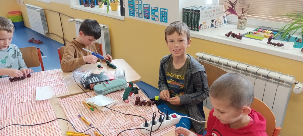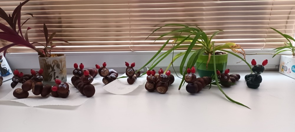 Nápad, který vznikl od dětí a díky dětem. Jednoho dne přišla Ellenka Watzke s taškou plnou kaštanů a nápadem, že něco vyrobíme. Ellenku napadly housenky. Téma jsme měli, ale museli jsme zajistit věci pro výrobu. Další děti donesly tavné pistole, šípky a mohli jsme začít. Při práci s tavnou pistolí mě děti velmi překvapily a moje obavy se rozplynuly. Sice pár drobných spálenin bylo, ale nic, co by nevyřešila studená voda. A výsledek? Můžete posoudit sami.