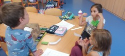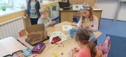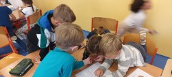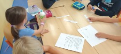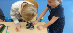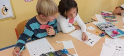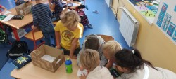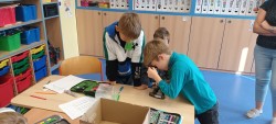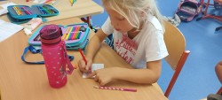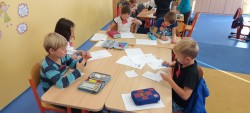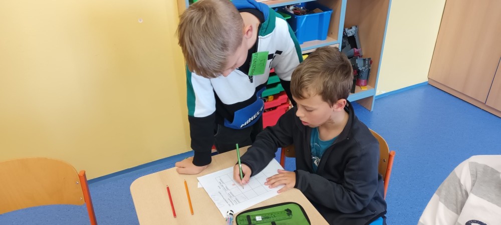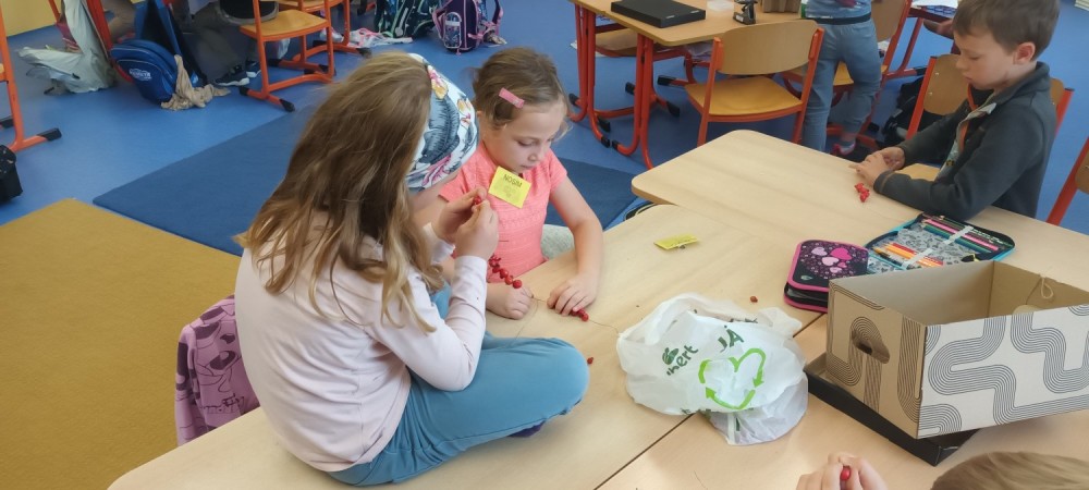 První centra aktivit v tomto školním roce byly na téma Les. V centru čtení a psaní měli za úkol roztřídit pravdivé a nepravdivé věty o lese. Společně psali životabáseň na téma Podzim. Centrum matematiky bylo zaměřené na práci se zvířátky Dědy Lesoně a překreslování obrázků podle osové souměrnosti. V centru pokusů a objevů jsme zkoumali šípek pod mikroskopem a lupou. Posledním centrem byl ateliér, kde jsme vyráběli srdce ze šípků. Šípky jsme si společně o den dříve šli nasbírat. Toto centrum stálo děti pár škrábanců, zapíchnutý trn v prstu a drátem propíchané prsty, ale stálo to za to.