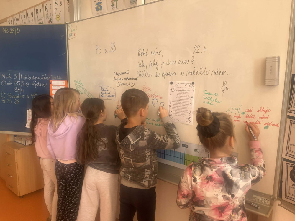 Svátek Země, který se v ČR poprvé slavil v roce 1990, jsme si v naší třídě připomínali během celého vyučování. Vše začalo už ranní zprávou, kde jsme se měli zamyslet, co bychom naší planetě vzkázali. V dalších předmětem učení vždy souviselo s ochranou přírody, vyvrcholením celého našeho snažení byl plakát - kooperativní omalovánka, kterou i v těchto dnech ještě stále doplňujeme o další a další vzkazy...