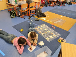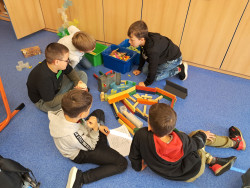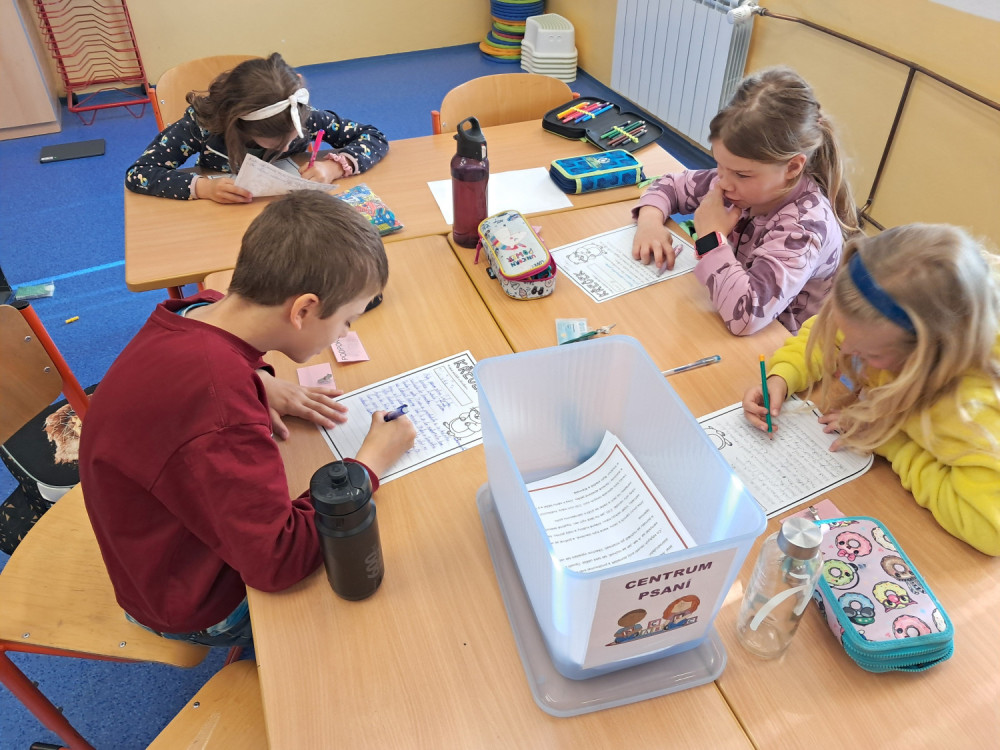 Inspirací pro naše další centra aktivit byl náš školní mazlíček - křeček Piškotka. Zároveň byla hlavní hvězdou center pokusů a objevů, kde děti stavěly a vymýšlely různá bludiště, kterými Piškotka musela prolézat. V centru matematiky plánovali za pomocí Beebotů den křečka a naplňovali jeho potřeby. V centru ateliér kreslili reálného křečka podle video návodu. V centru čtení pracovali s knihou Křeček a vyhledávali informace, jak o křečka správně pečovat. V centru psaní psali příběh o křečkovi a velmi jsme se u toho nasmáli.