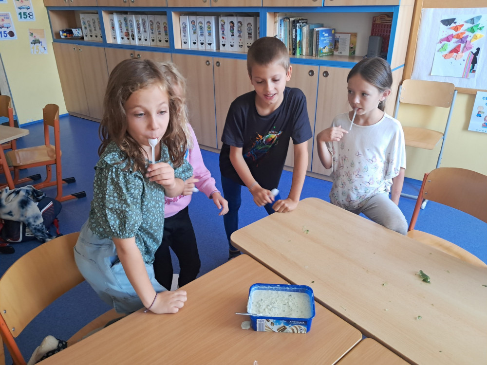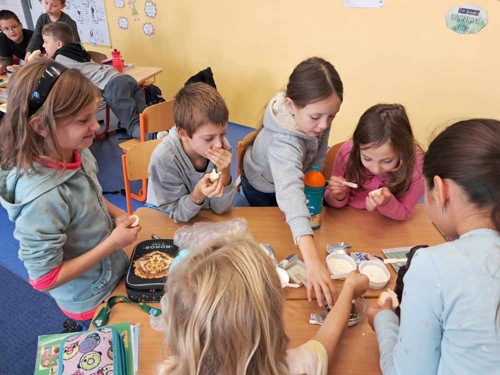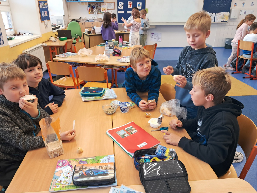 Rádi ochutnáváme a rádi jíme. A proto jsme si připravili pokrm Tzatziki podle receptu v rámci Dne evropských jazyků, kde jsme cestovali do starověkého Řecka. Další týden nás čekala ochutnávka sýrů a příprava jednohubek. Překvapilo nás, že sýr s kozím tvarohem je moc dobrý. Nejvíce nám chutnal čerstvý sýr s medem a semínky - zajímavá kombinace. Děti ji doporučovaly všemi deseti.