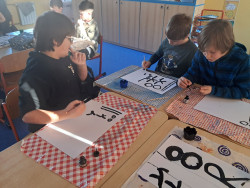 Na závěr workshopu lektor předvedl své mistrovství, když znovu napsal slovo „kůň“, tentokrát s precizností a lehkostí zkušeného kaligrafa. Vrcholem pak byla ukázka obřích štětců, které se používají pro monumentální kaligrafické práce, což v žácích vyvolalo úžas a respekt k tomuto umění.