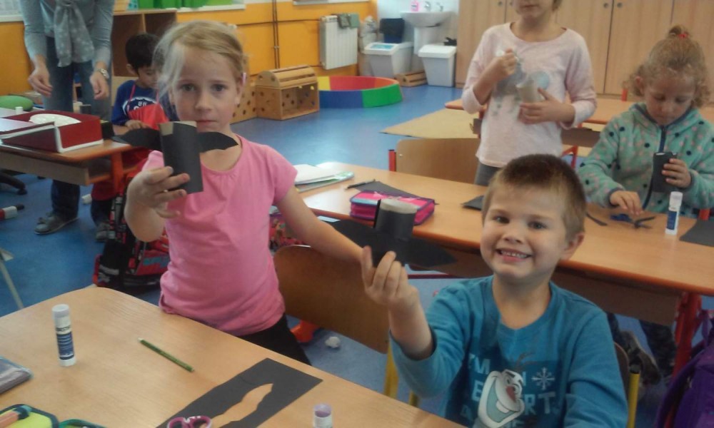 13. 11. 2018 Vyráběli jsme netopýry z papíru a společně jim vytvořili skálu z listí. Učíme se práci s vodovými barvami a podařilo se nám nakreslit obrázky s dráčkem. Při skupinové práci jsme si pomáhali při stavění domečků pro zvířátka. 18 / 11 / 2018 VS