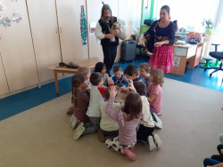S dětmi jsme se zúčastnili kulturní akce v modřické MŠ. Celým programem nás provedli Ondřej a Lucie Tryhuci a formou výchovného koncertu dětem představili zajímavý hudební nástroj dudy. S kozlíkem, jak se říkalo českým dudám, se děti podívaly na dudy z celého světa a mohly jejich tvar i zvuk porovnat s českým kozlíkem. Dětem byly představeny dudy z Chorvatska, Španělska, Slovenska i z Brna. Společně s dudami si děti vyzkoušely hru na buben i doprovod tleskáním a dupáním. Všichni jsme poznávali a zpívali lidové písničky i písničky z pohádek a za správné odpovědi dostali autorské omalovánky.
