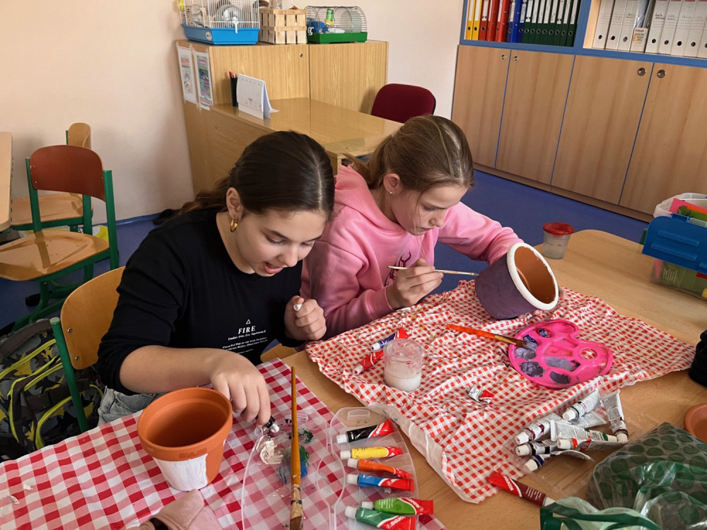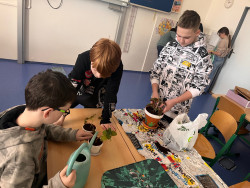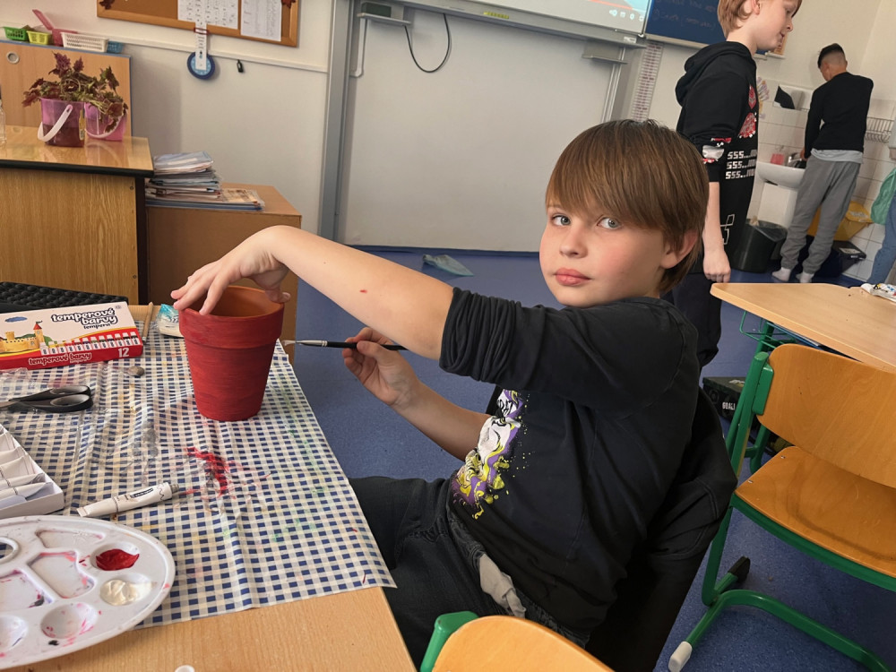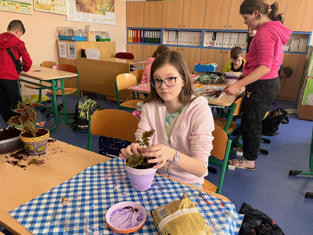 V pracovních činnostech jsme si nejprve nazdobili vlastní květináč, po té jsme do něj zasadili pokojovou květinu - okrasnou kopřivu nebo léčivý rýmovník. Aby se nám sazenice pěkně rozrostly, musíme teď o ně pravidelně pečovat, abychom si domů odnesli zdravé a pěkné pokojovky.