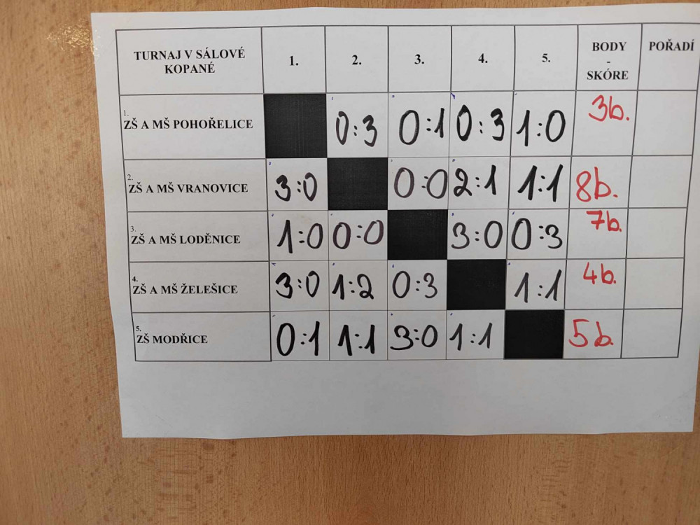 Dnes se chlapci zúčastnili přátelského Velikonočního turnaje v sálové kopané v Pohořelicích. Turnaje si zahrálo pět základních škol. Naši žáci vybojovali jednu výhru, dvě remízy a jednou prohráli. Celkem se tak umístili na krásném 3. místě. Všem moc gratulujeme k úspěchu.