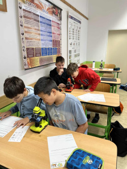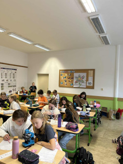 Během druhé a třetí hodiny se třída 6. B pustila do mikroskopování. Žáci si připravili vlastní nativní preparát ze senného nálevu, pozorovali mikroskopické organismy a zapisovali svá pozorování do pracovních protokolů. Naučili se také rozpoznávat různé druhy nálevníků a popisovat jejich stavbu.
