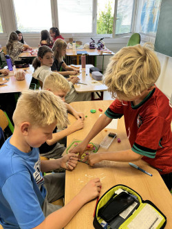Ve čtvrté a páté hodině se žáci proměnili v malé biology–tvůrce. Každá skupina si vylosovala jeden typ buňky, který měla vymodelovat z plastelíny, popsat jeho části a doplnit pracovní list s informacemi o jeho funkcích. Nechyběla ani kreativita a týmová spolupráce – vznikly velmi povedené modely plné barev a nápaditých detailů.
