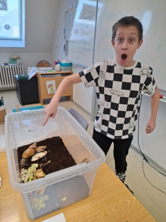 Jedním z nejzajímavějších okamžiků byla návštěva, kdy jsme si mohli zblízka prohlédnout africké oblovky 🐌. Tyto obrovské šneky jsme si na chvíli „půjčili“ do třídy, a i když jsme je měli jen jeden den, nadchli nás svou velikostí i klidnou povahou.
