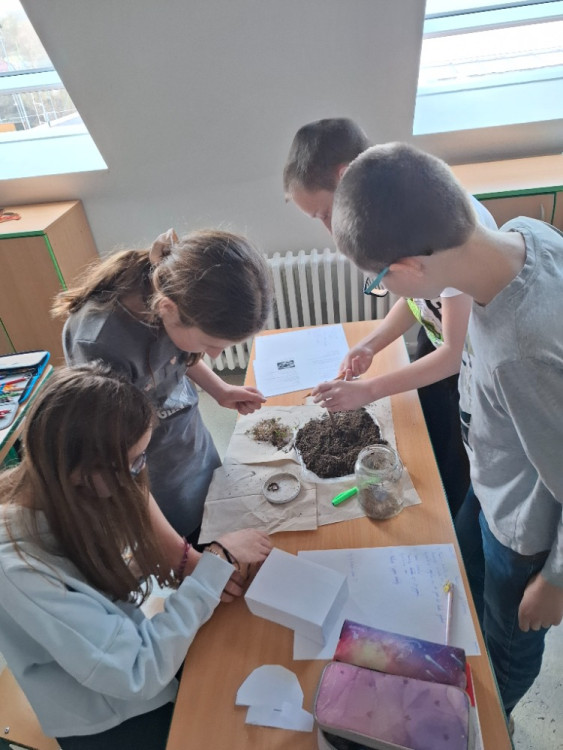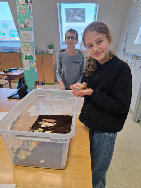 Také jsme se podívali pod povrch půdy. 🌍 Pomocí jednoduchých pastí jsme zkoumali půdní živočichy – objevili jsme spoustu malých, nenápadných tvorů, kteří mají velký význam pro zdraví půdy. Nejvíce nás zaujaly žížaly. Mohli jsme tak sledovat, jak přeměňují zbytky na úrodnou půdu – skuteční mistři kompostování!