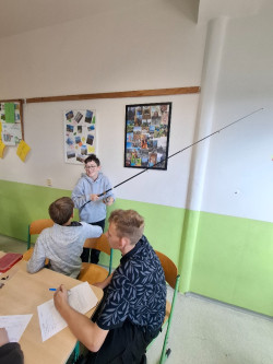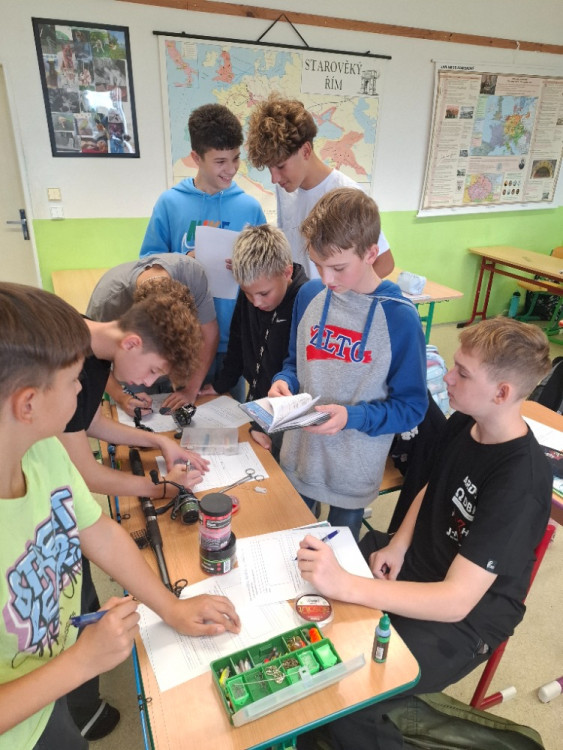 – přinesli do školy své vybavení: pruty, navijáky, návnady, podběráky i různé druhy nástrah. Vznikla tak malá výstava, kde si každý mohl pomůcky prohlédnout zblízka, osahat si je a zjistit, jak se používají v praxi.