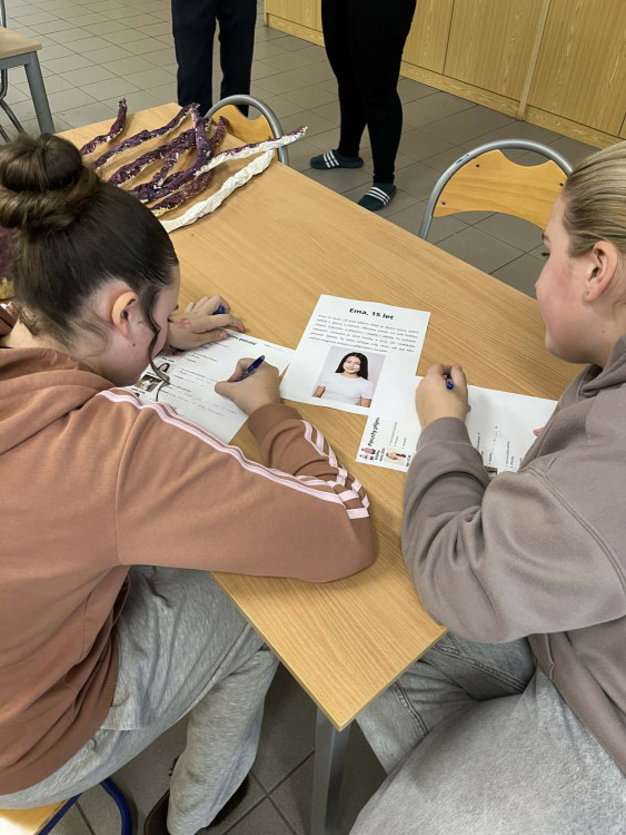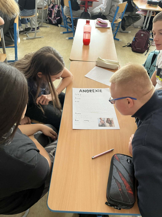 Následovala aktivita, při níž žáci četli příběhy skutečných lidí, kteří se s poruchou potýkají. Jejich úkolem bylo zjistit, o jakou poruchu se jedná, jaké jsou její příčiny a jaké následky může mít. Tato část byla velmi silná – žáci měli možnost nahlédnout do individuálních životních situací a uvědomit si, že poruchy příjmu potravy nejsou jen teoretické pojmy, ale reálné problémy, které přinášejí bolest i dlouhodobé následky.