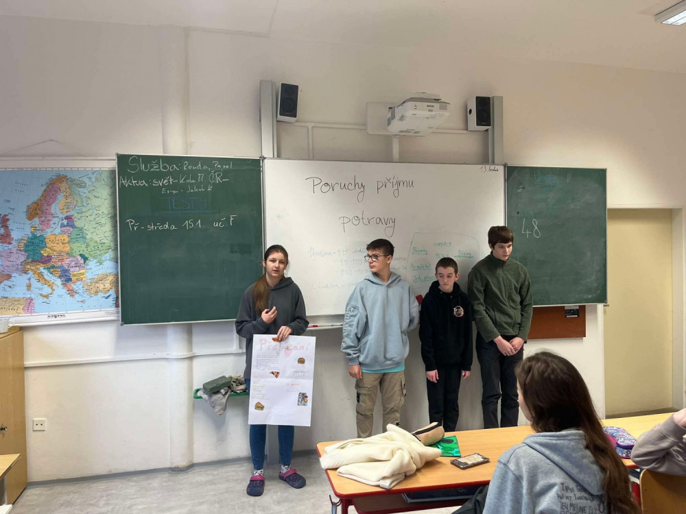Druhou hodinu žáci své postery prezentovali před třídou. Každá skupina představila zvolenou poruchu, popsala její příznaky, důsledky a možné příčiny. Prezentace byly zajímavé a ukázaly, že žáci dokázali téma dobře pochopit a zpracovat.