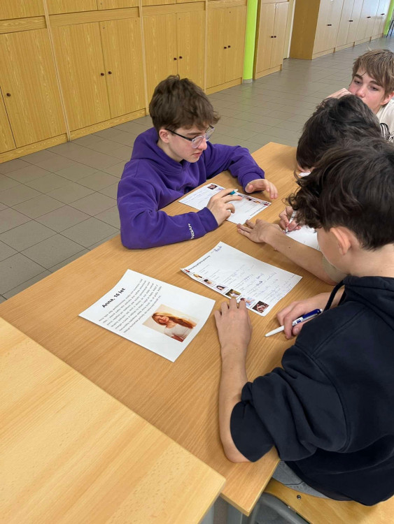 Ve třetí hodině se žáci věnovali příběhům lidí trpících poruchami příjmu potravy. Úkolem bylo identifikovat konkrétní diagnózu, popsat příznaky a zamyslet se nad možnými následky dané situace. Tato aktivita podpořila jejich schopnost analyzovat a vcítit se do problémů druhých.