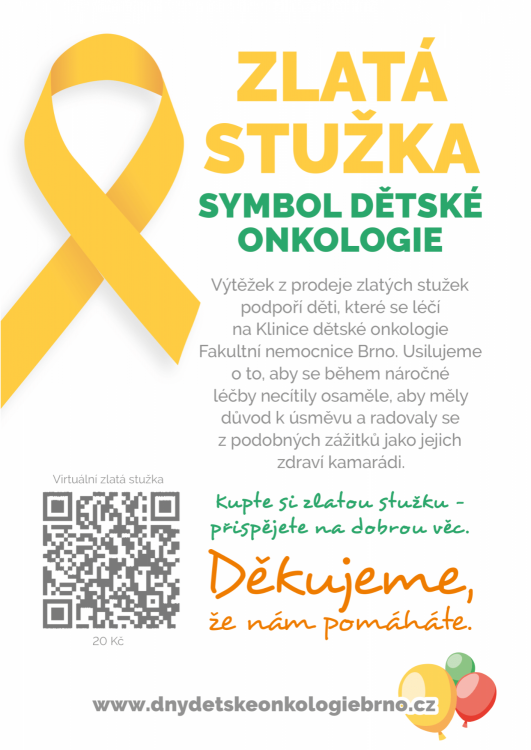 V týdnu od 3. do 7. března budou na vrátnicích školy — jak na budově Komenského, tak na budově Benešova — umístěny kasičky. Nákupem zlaté stužky za 20 Kč či jiným finančním příspěvkem můžete pomoci podpořit léčbu dětských pacientů.
