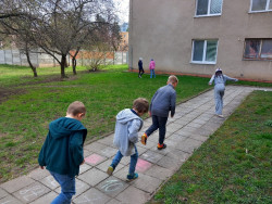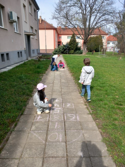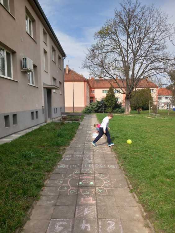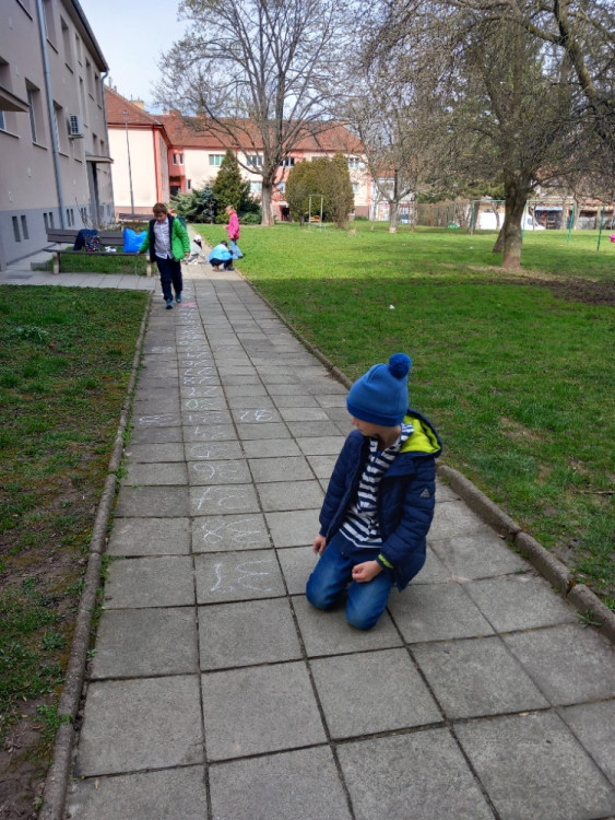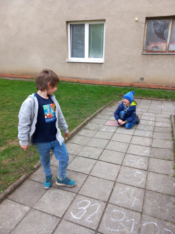 Na hřišti Plácek nejraději hrajeme malou kopanou nebo stavíme skrýše pro zvířátka. Tentokrát jsme si na chodník nakreslili několik skákacích panáků, jednoho až do čísla 100 s překážkami a někteří si tohoto panáka opravdu 100x skočili!