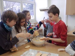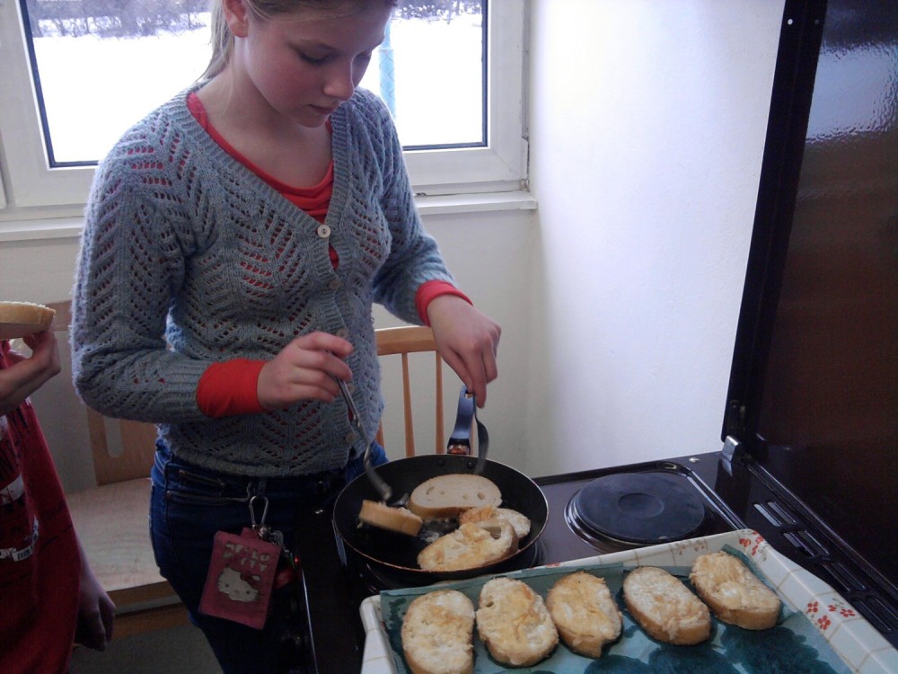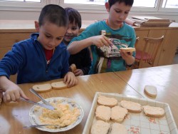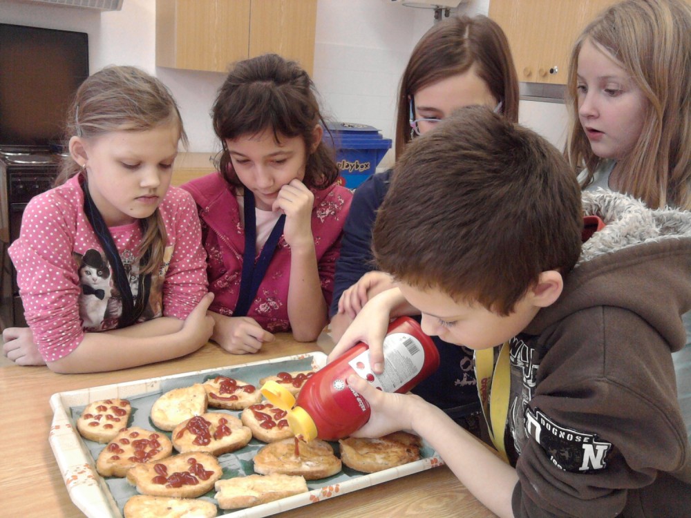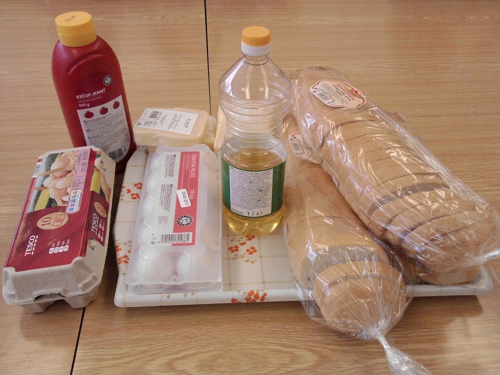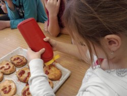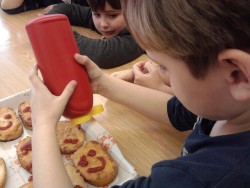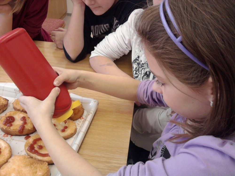 Veka namazaná rozšlehaným vejcem s nastrouhaným sýrem - opečená a ozdobená kečupem - to je dobrůtka, kterou jsme zkoušeli v dnešních kuchařích. Opečenky lze ozdobit vším možným - majolkou, hořčicí, zeleninkou. Dětem moc chutnalo:)))