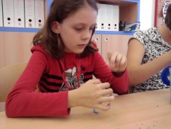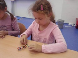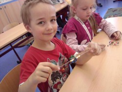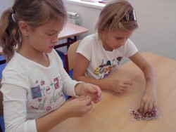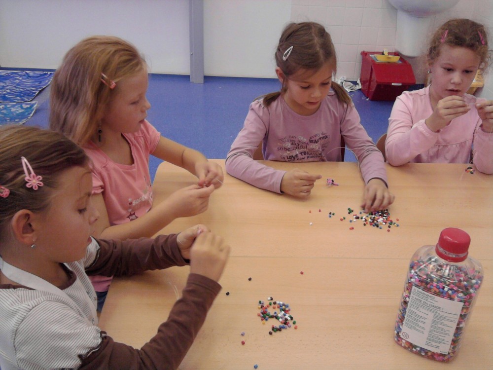 Konečně nám začal i kroužek Výroba šperků. Dnes jsme se učili navlékat korálky do tvaru koleček - nejmenší prvňáčci pracovali s většími korálky, větší holčičky s těmi nejmenšími. Vyráběli jsme náramky. Dětem se velice vyvedly:)))