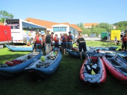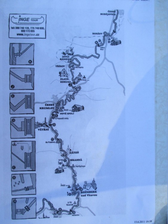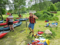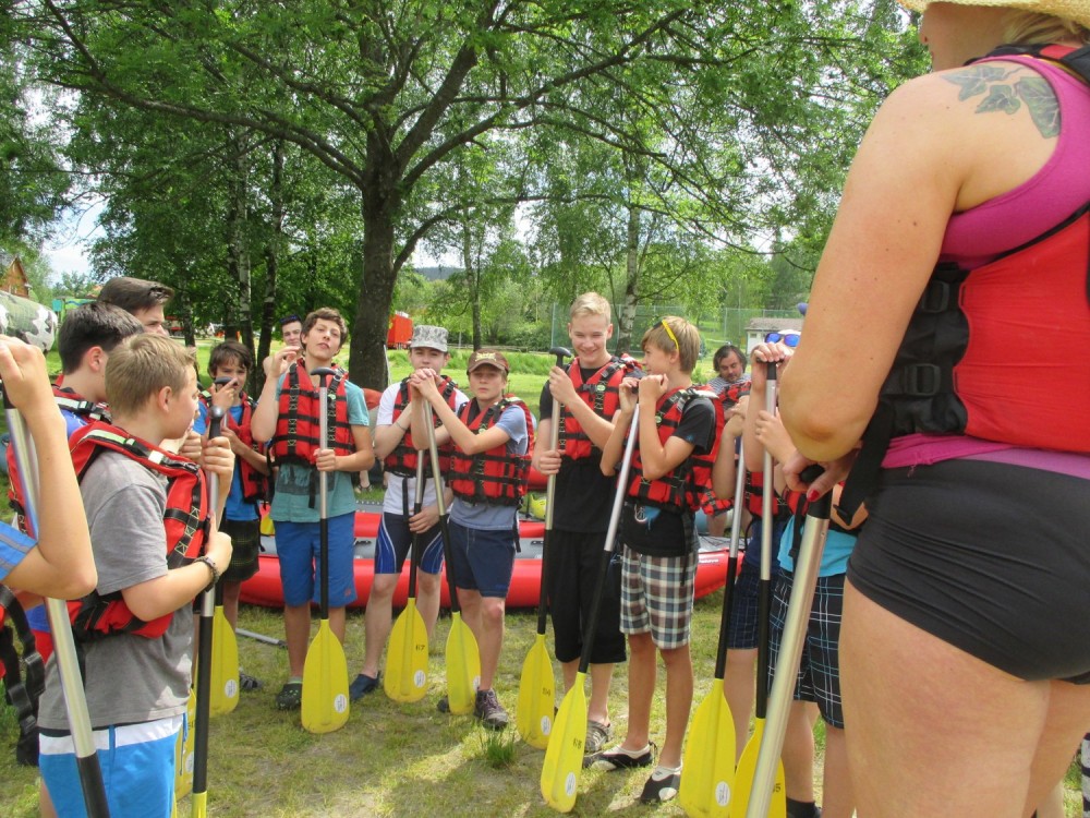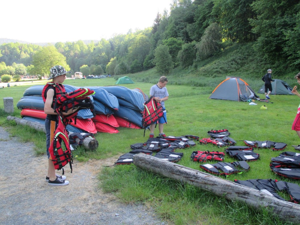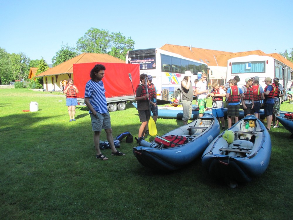 Po cestě autobusem, během které se nedočkavci každých pět minut ptali, kdy už tam budeme, jsme po asi pěti hodinách dorazili do Vyššího Brodu. Zde nejprve proběhla základní instruktáž nejen pádlování a pohybu ve vodě, ale i péče o lodě a další zapůjčené vybavení (vesty, pádla, ...) A po této instruktáži se konečně mohly nedočkavé posádky nalodit a vyrazit vstříc dobrodružství. A po absolvování prvních asi jedenácti kilometrů řeky jsme odpoledne dorazili do kempu Rožmberk, který se stal naším prvním dočasným domovem.