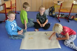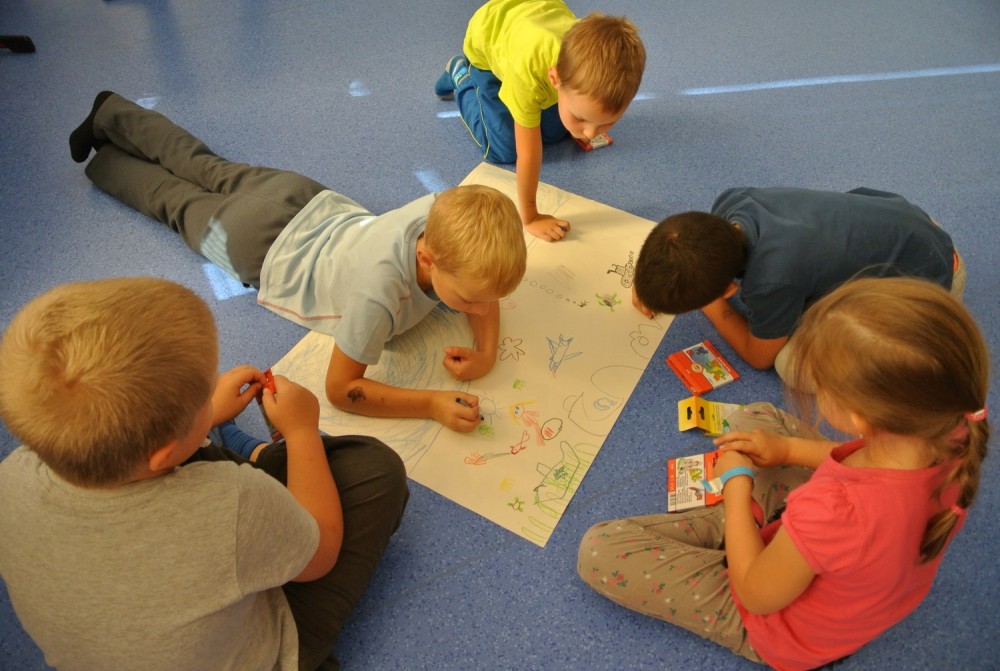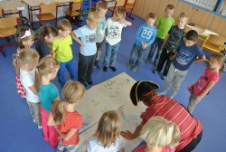 Dnes nás navštívil pan Libor, který nám připravil naprosto úžasný program, abychom se seznámili a lépe poznali. Nejprve jsme hráli hry v kruhu, abychom si lépe zapamatovali jména spolužáků, pak jsme se proměnili v auta a zajeli si do ZOO, cirkusu, atd. Ve druhé hodině jsme se proměnili v námořníky. Společně jsme pluli na lodi, plavali v moři a to, co jsme v něm potkali nebo zahlédli, jsme pak ve skupinkách namalovali.