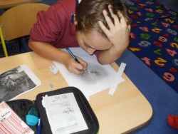 Dokončujeme práci na dárečku pro rodiče, textilní barvou zdobíme oblečení, glazujeme a zdobíme svícny na jarmark.