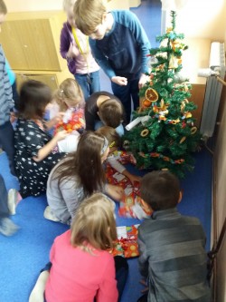 Vánoce jsou tady....všechny balíčky adventního kalendáře jsme rozbali a my se těšíme na Ježíška. Maminky nám napekly cukroví, které jsme ochutnávali. Zazpívali jsme si u vánočního stromečku koledy. Aby nám Ježíšek mohl dát dárky pod stromeček, šli jsme na procházku. Nejvíc nás zaujali zamrzlé kaluže. Po procházce jsme měli dárky již pod stromečkem. Každý si našel svůj dárek. A co jiného nám Ježíšek mohl přinést? Přeci knihu, abychom si vytvořili vlastní třídní knihovničku.
