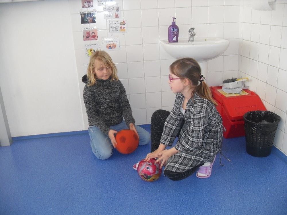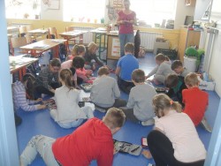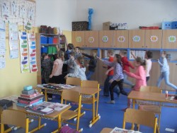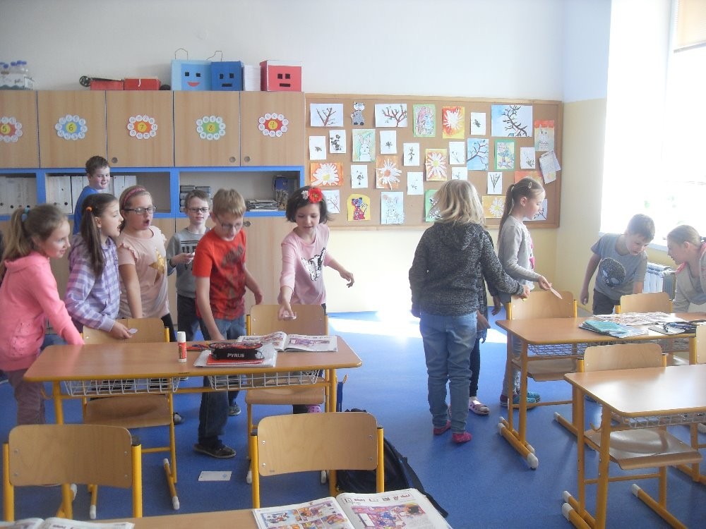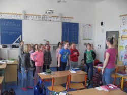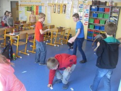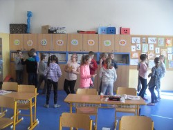 Nemusíme se vždy učit jen v lavicích. Například v angličtině využijeme celý prostor třídy opravdu naplno. Nejprve si nakreslíme diktát (ano - opravdu kreslíme - podle diktovaných pokynů), potom se anglicky protáhneme a nakonec zazpíváme písničky. Přitom si nenápadně upevníme slovní zásobu :-).