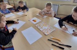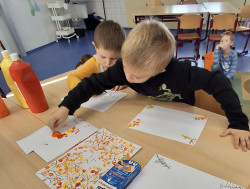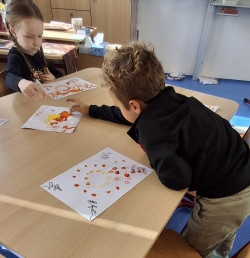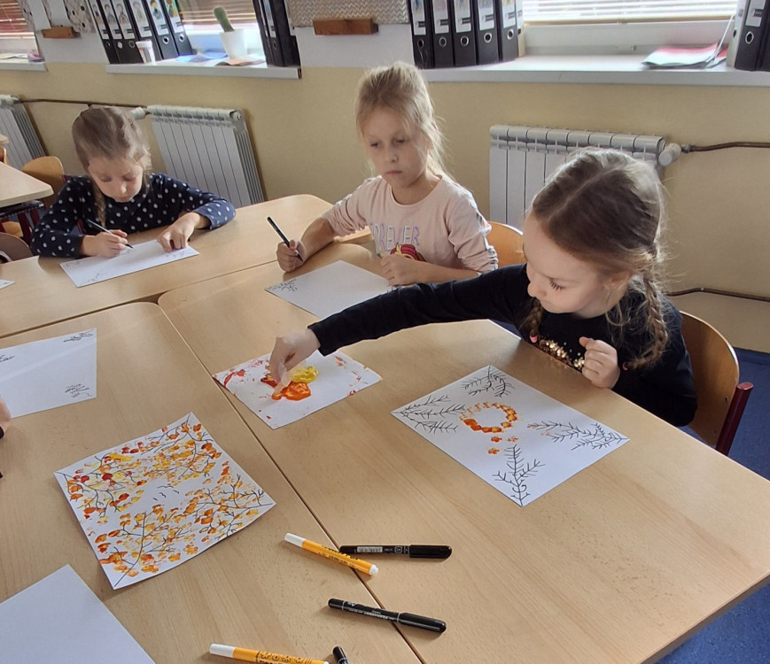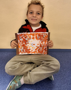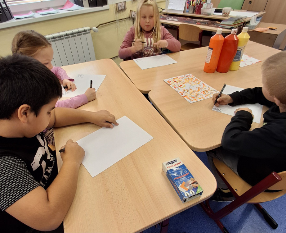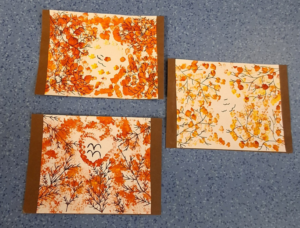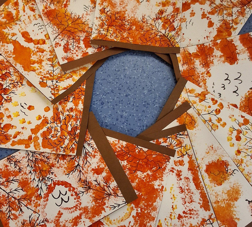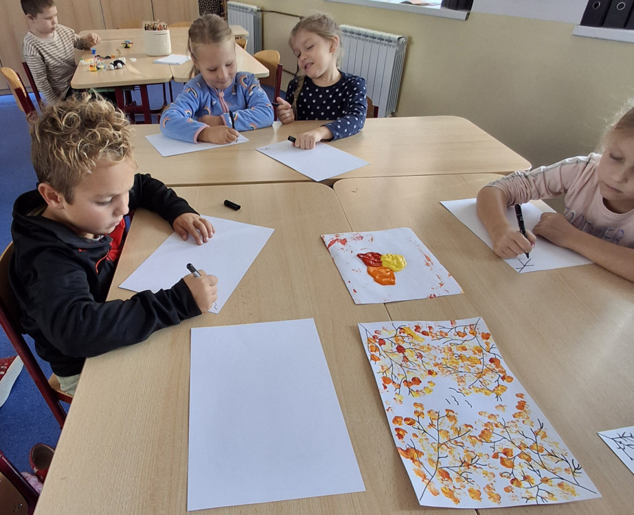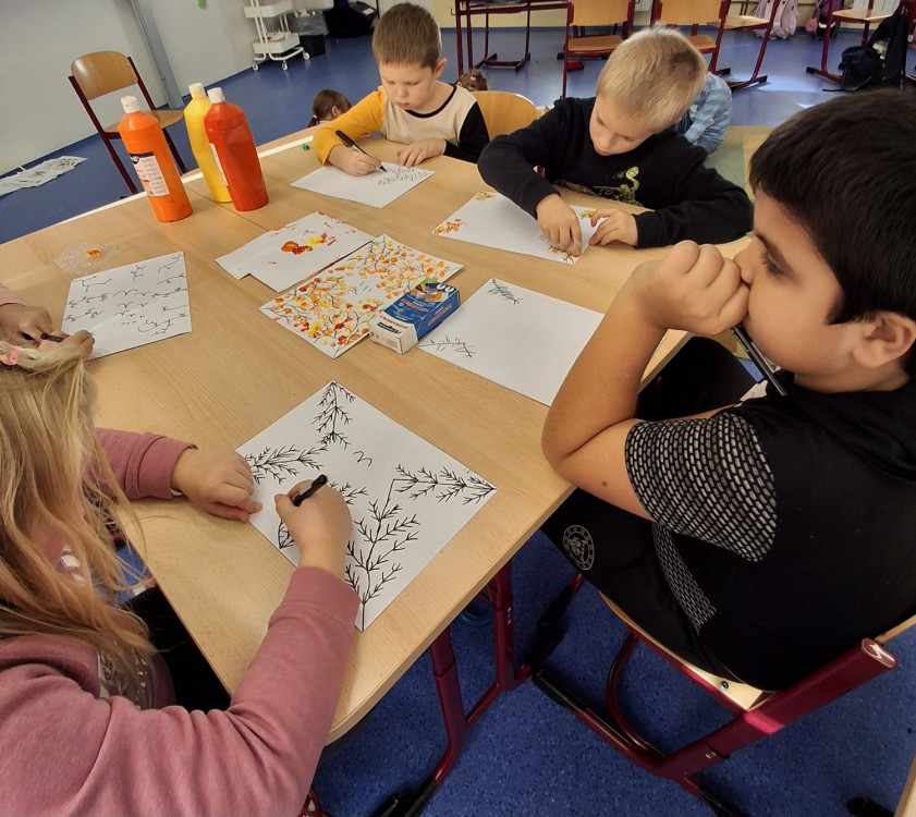 Při odpoledních procházkách s dětmi pozorujeme krásně zbarvené listí, které opadává ze stromů. A jak to vidí naše oči, tak to jsme ve družině přenesli na papír. Černou fixou jsme nakreslili stromy, listí jsme tvořili bublinkovou fólií tupkáním do temperových barev podzimních odstínů. Hotový výkres jsem dětem pomohla nalepit na hnědý karton, aby se výsledný efekt více zvýraznil.🙂