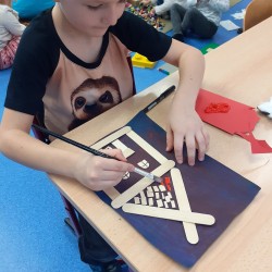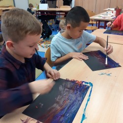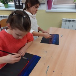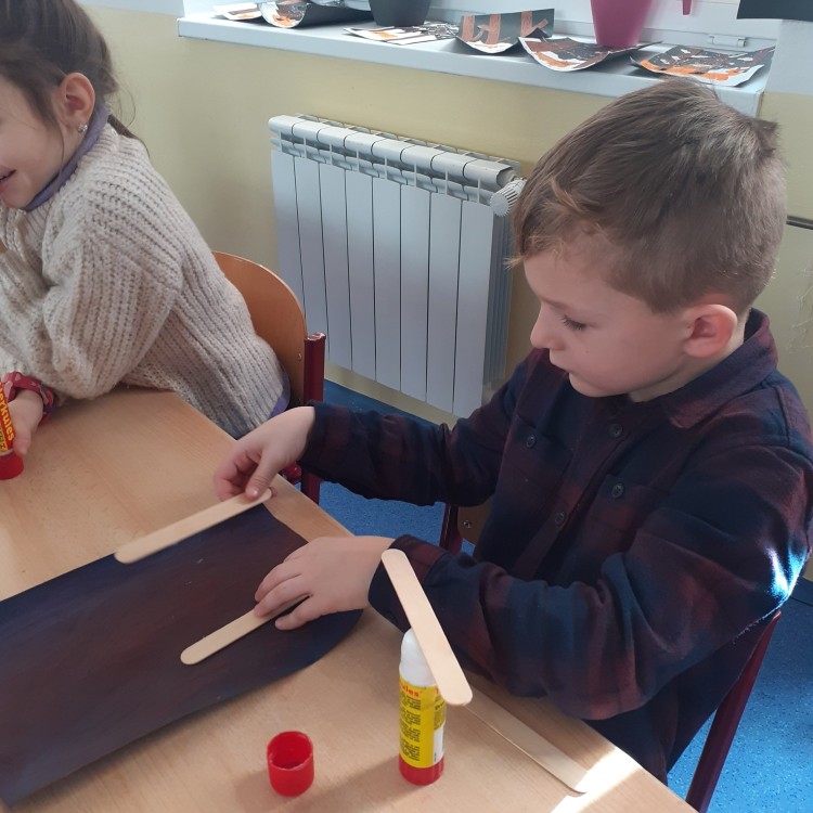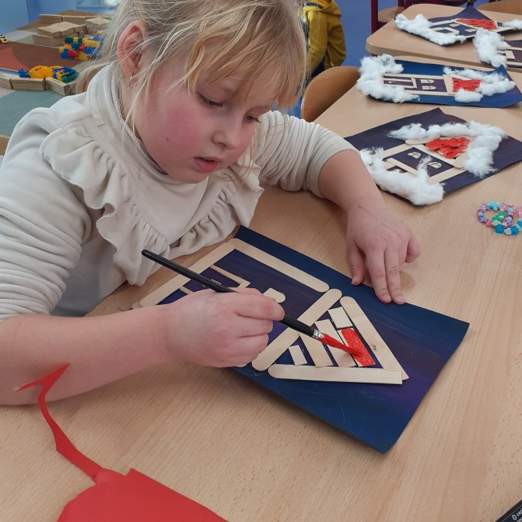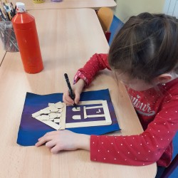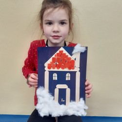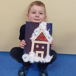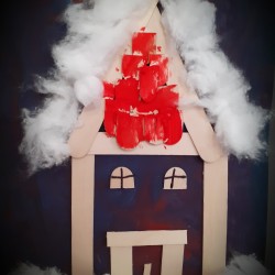 S dětmi jsme si pár takových horských chaloupek vytvořili. Nejdříve jsme si udělali podklad ze zimních barevných odstínů-červená, fialová a modrá. Na chaloupku jsme použili dřevěné špachtle, které jsme lepili na podklad. Ze zbytků špachtlí jsme lepili křidlice, které jsme natřeli červenou temperou. Další zbytky se využily na okna a dveře. Na horách bývá hodně sněhu a my si ho nahradili bílou vatou. Chaloupka je hotová a povedla se:)