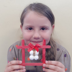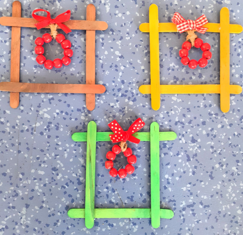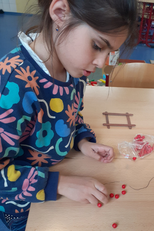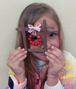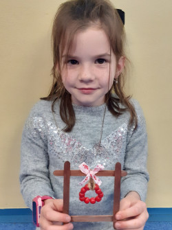 Děti si vybraly z různých barev špachtlí, jak bude vypadat jejich okénko, stuhu se vzorkem, navlékly korálky na drátek a já jsem jim pomohla s lepením špachtlí pomocí tavné pistole a s dokončováním celé dekorace, která je jen pro Vás milé maminky 🙂🌹.