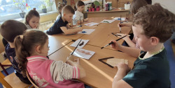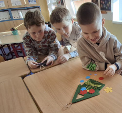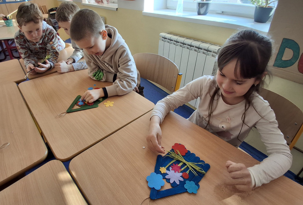 Společně tvoříme " jarní domeček" z dřevěných špachtlí. Jednotlivé díly se slepily tavnou pistolí a základ domečku je na světě. Akrylovými barvami vybraných ostínů jej natíráme. Po zaschnutí nalepíme látkové květy se sušenou dekorací.