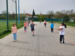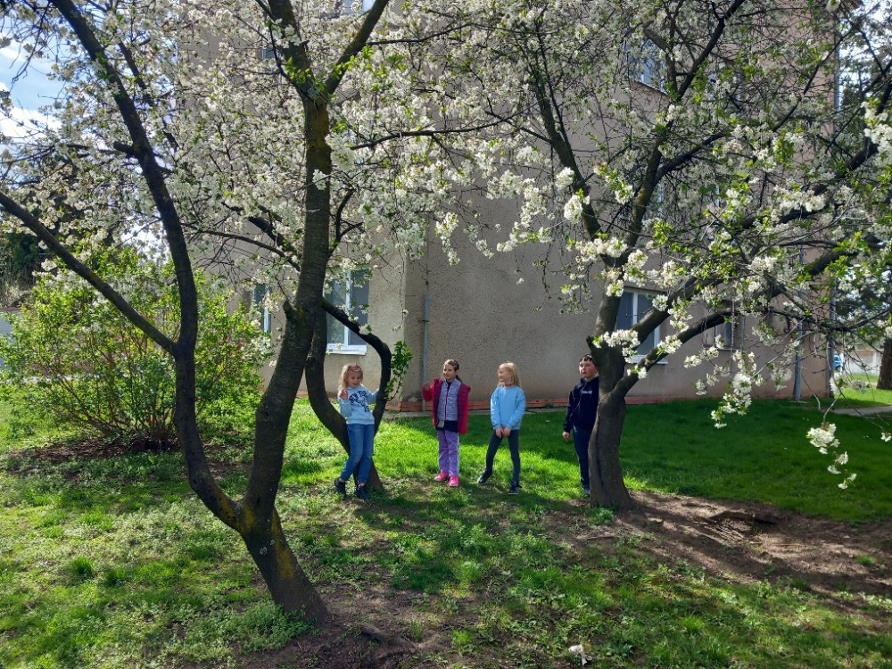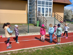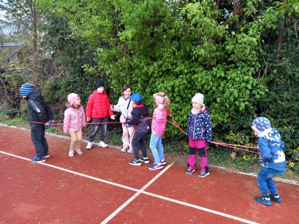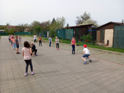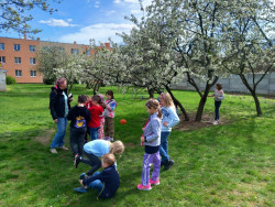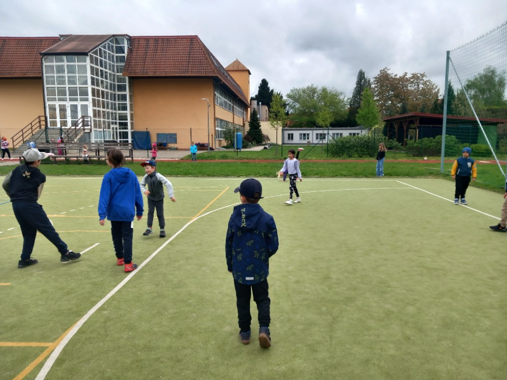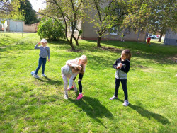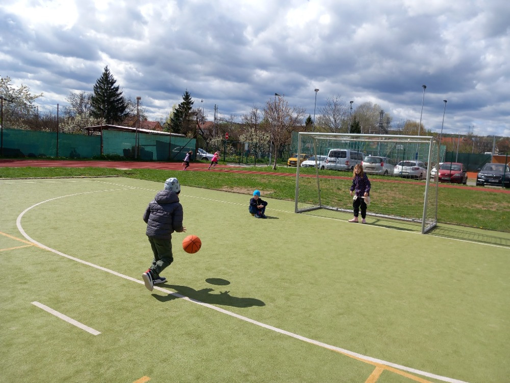 Jsme rádi, že nám počasí přeje a můžeme chodit ven každý den. Na Plácku hrajeme na honěnou, na schovávanou a malou kopanou. Byli jsme si zasoutěžit ve dvou týmech v hodu ringokroužkem. Na hřišti Benešova poměřujeme své síly a dovednosti v kopané se jinými spolužáky nebo skáčeme přes gumu a vymýšlíme si různé pohybové hry se švihadly, gumou a míčem.