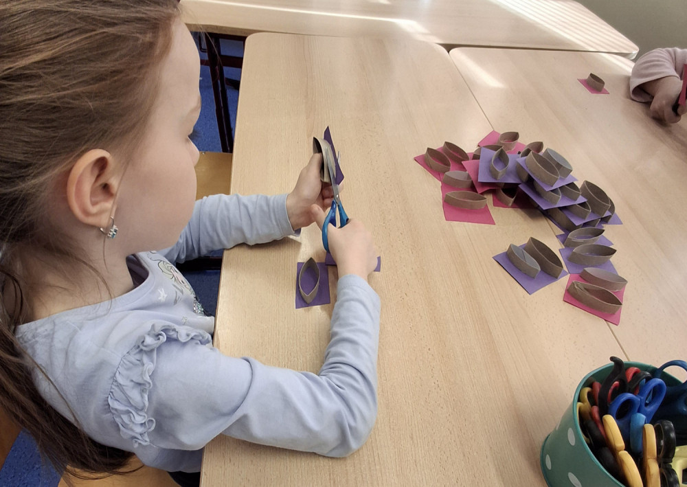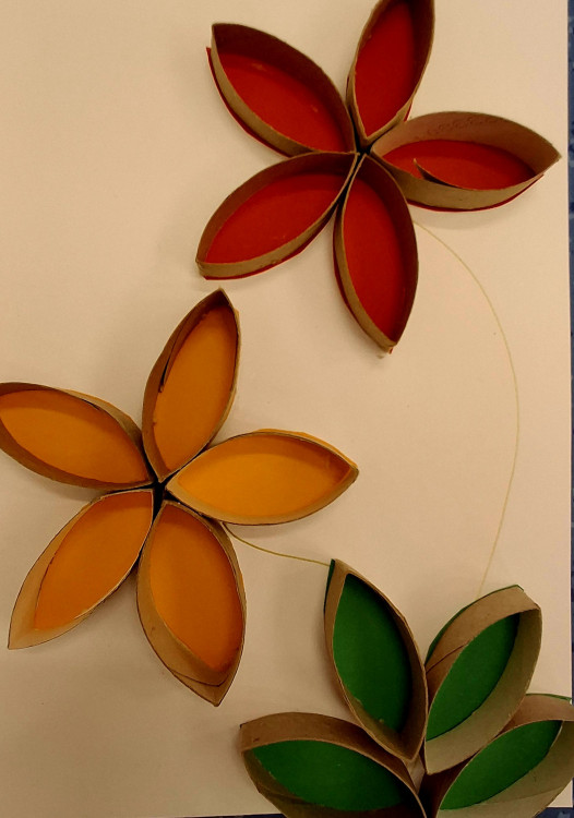 S dětmi jsme tvořili květiny tzv.3D. Předem nastříhané proužky z role toaletního papíru jsme nejprve nalepili na barevný papír, vystřihli, poskládali tvar květu a opět nalepili na tvrdý bílý karton. Fixem dokreslili stonek a máme hotovo🙂.
