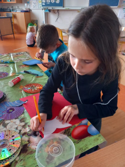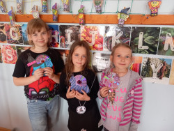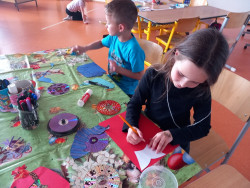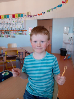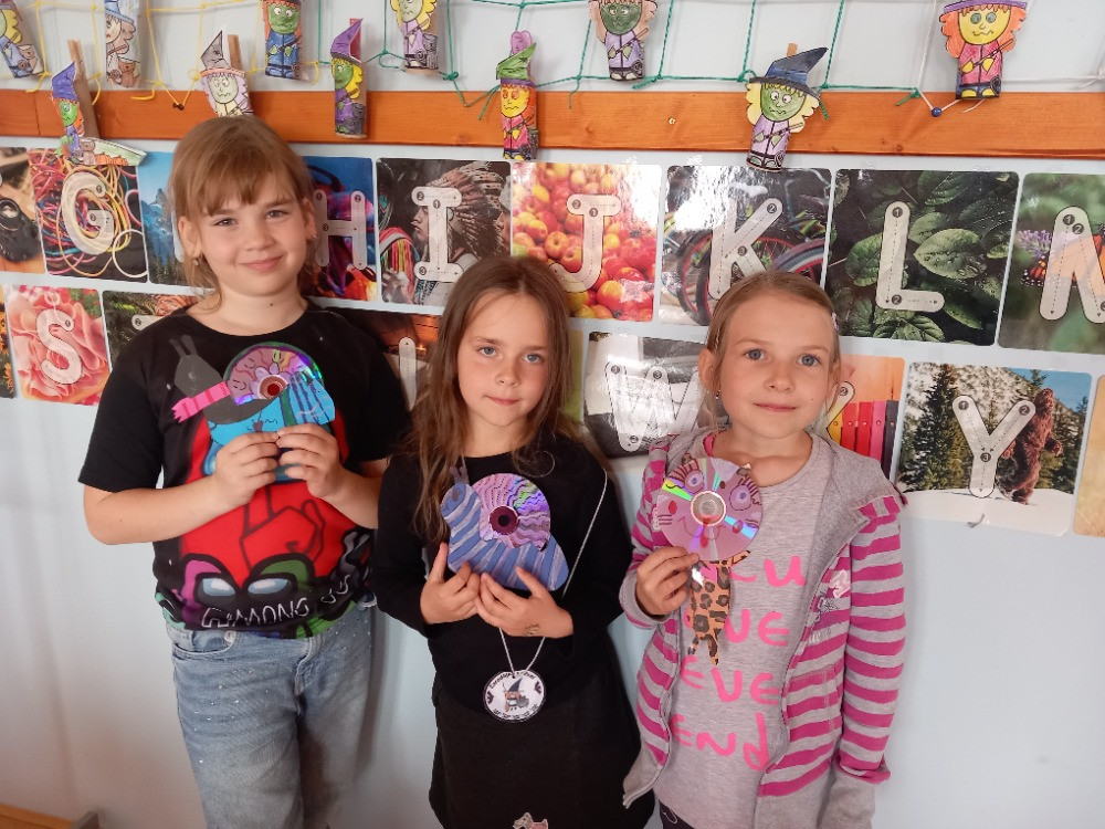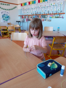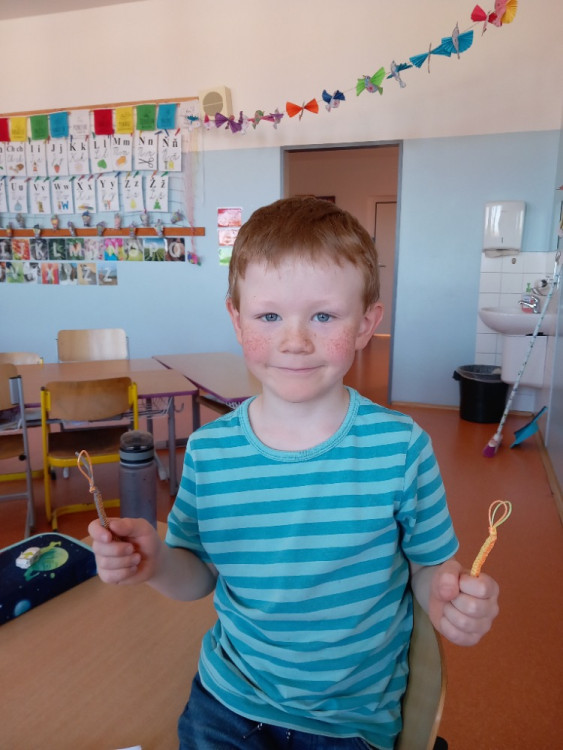 V květnu jsme se pustili do tvoření rybiček a "šneků" ze starých cd. Také se postupně seznamujeme s pletením přívěsků na klíče z barevných bužírek. Zatím se trpělivě učíme plést jedním způsobem, a to hranatou "bužírku". Začíná se nám dařit a máme z toho velkou radost :-)